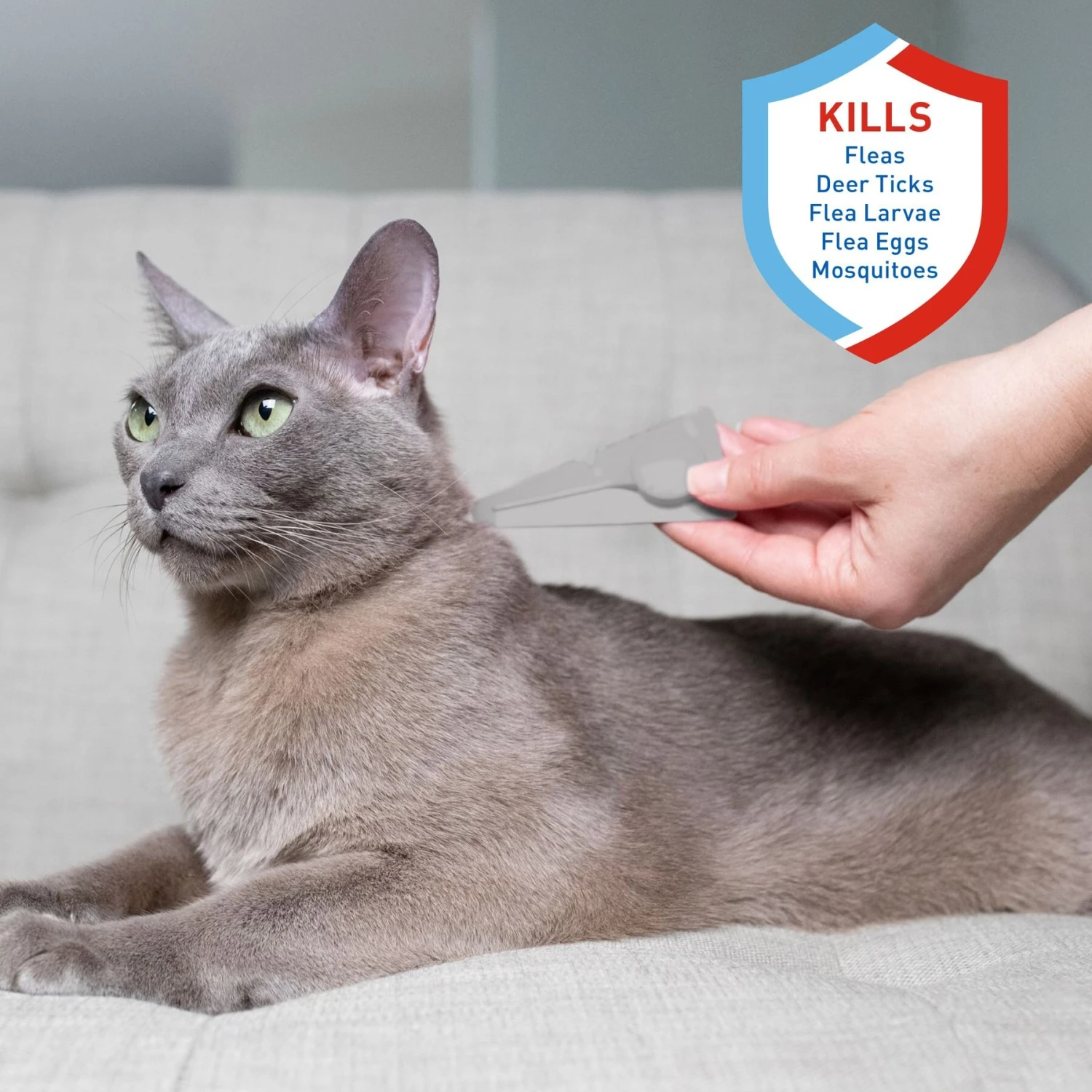 - Apply: The cat/kitten should be standing for easy application. Use tip of tube prior to application of the product, to gently lift the cat’s or kitten’s hair coat on the back of the neck at the base of the skull, position the tip of the tube on the cat’s exposed skin and squeeze out the entire contents of the tube onto the cat’s skin. Although the cat’s/kitten’s skin and hair oils will distribute the application over the entire cat/kitten, brushing the cat/kitten 12-24 hours after treatment will help to distribute the material over the skin.