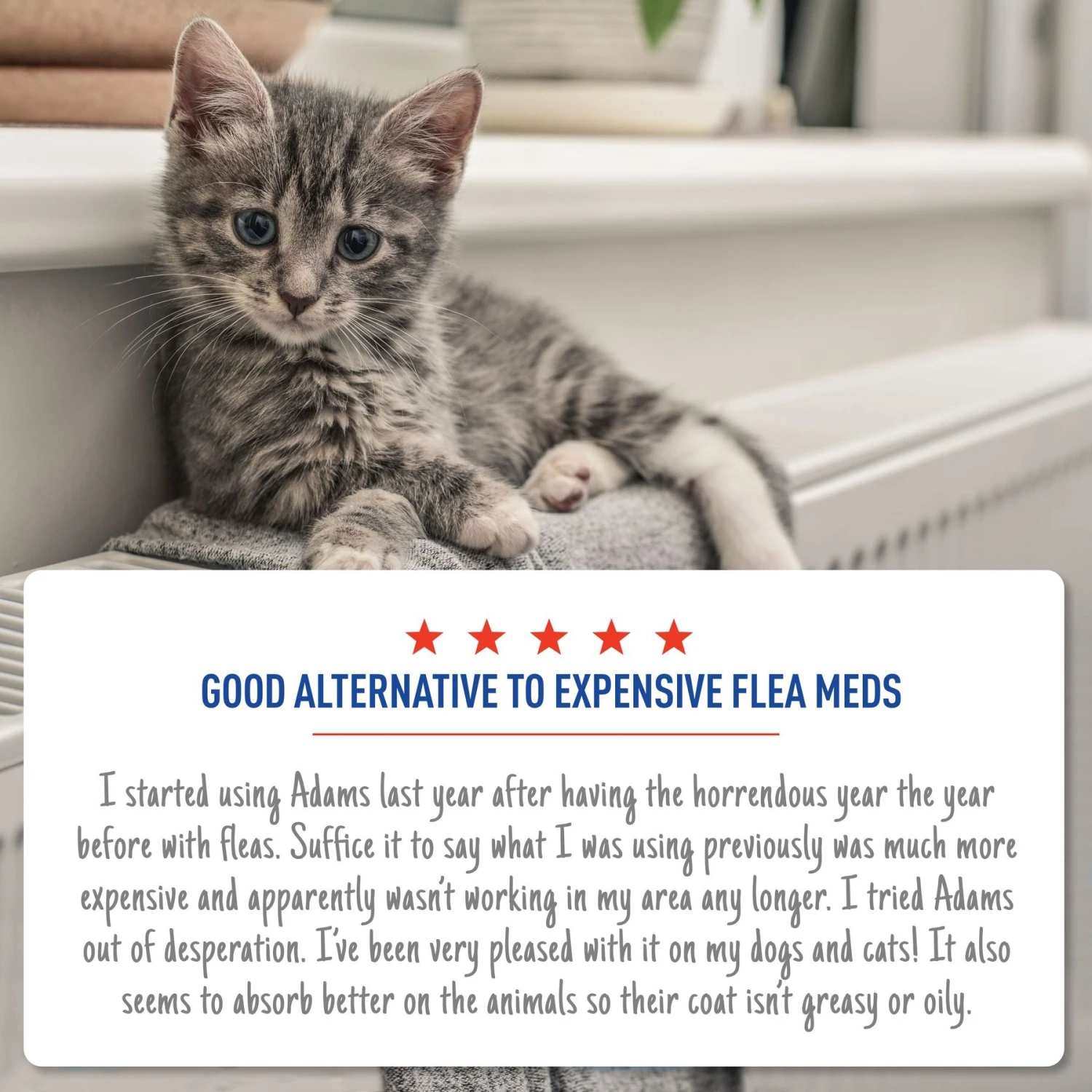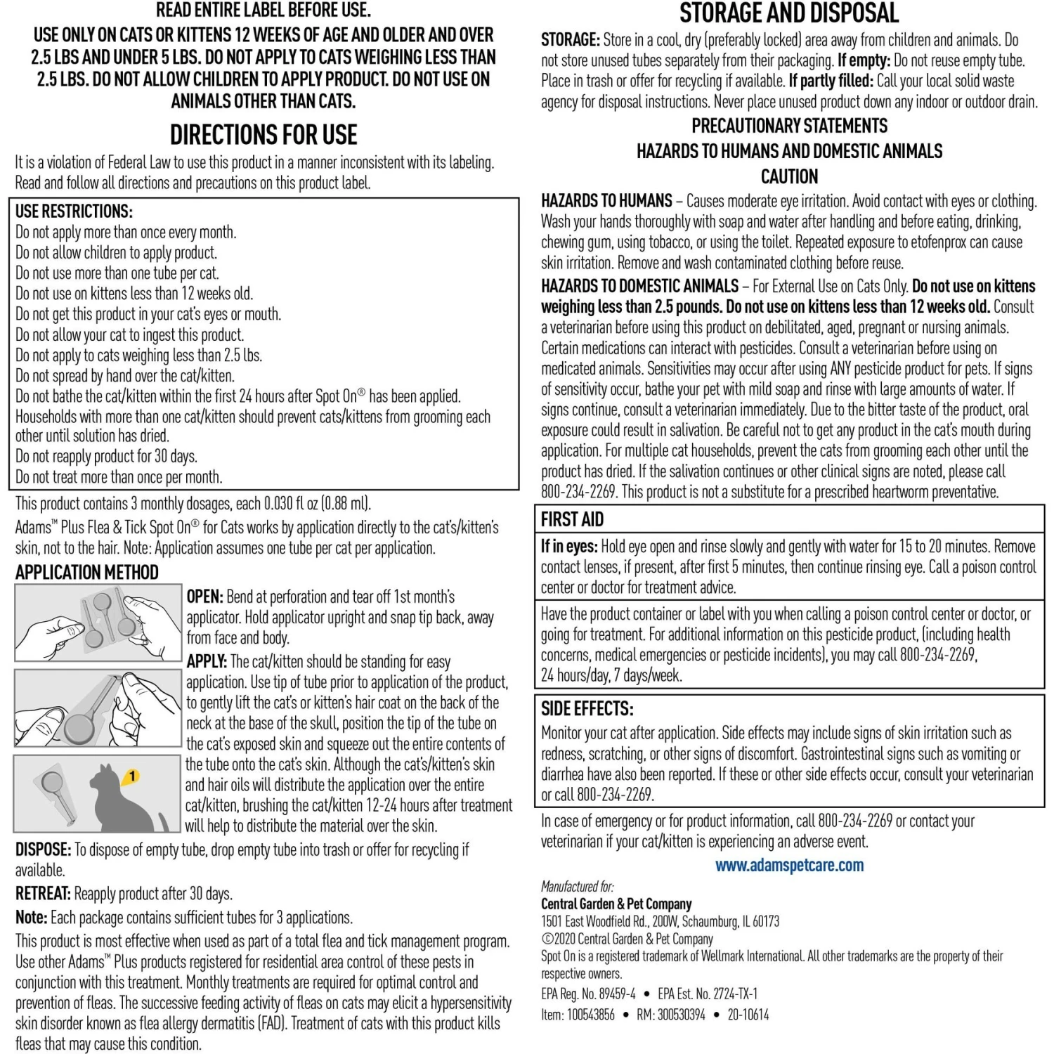 Adams Plus Flea & Tick Spot On for Cats is a long-lasting flea and tick treatment specifically formulated for cats. This five-in-one control treatment works to actively kill adult fleas, flea eggs, flea larvae, deer ticks and mosquitoes. Spot On breaks the flea life cycle by killing flea eggs before they hatch and flea larvae. It starts working on contact and helps prevent new flea infestations for up to one month. The long-lasting, quick-drying formula spreads over time with your cat’s movement through the skin and hair oils. Flea prevention has never been easier with Adams Plus!