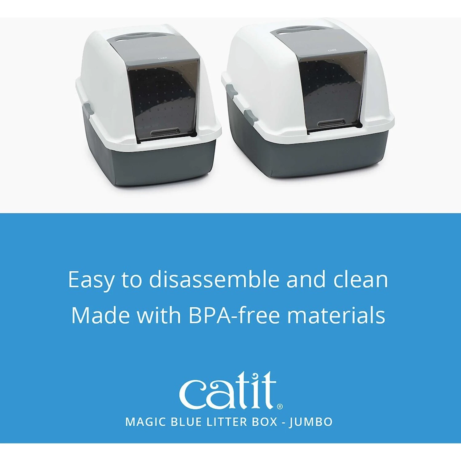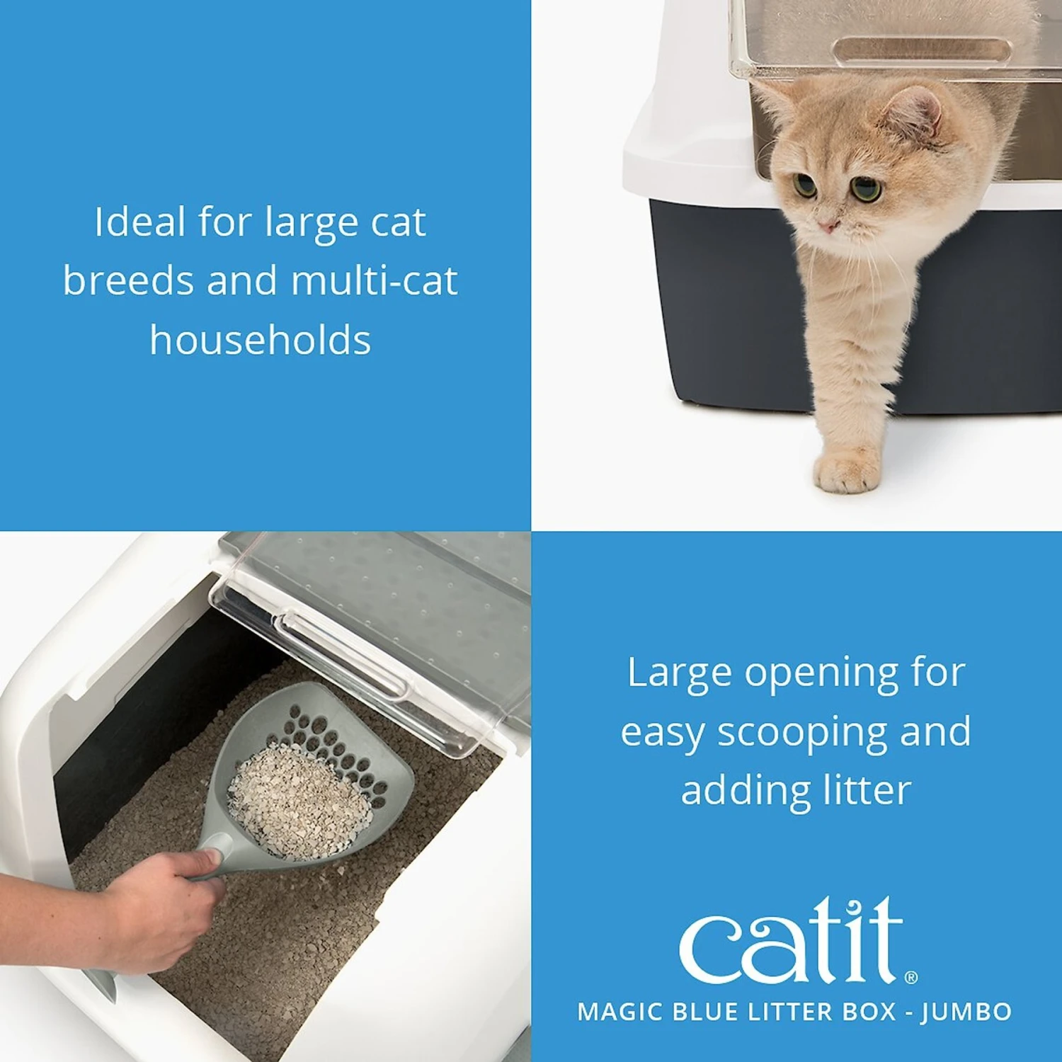 - The Catit Magic Blue Litter Box features a large top opening for easy scooping and a paw-safe front door.