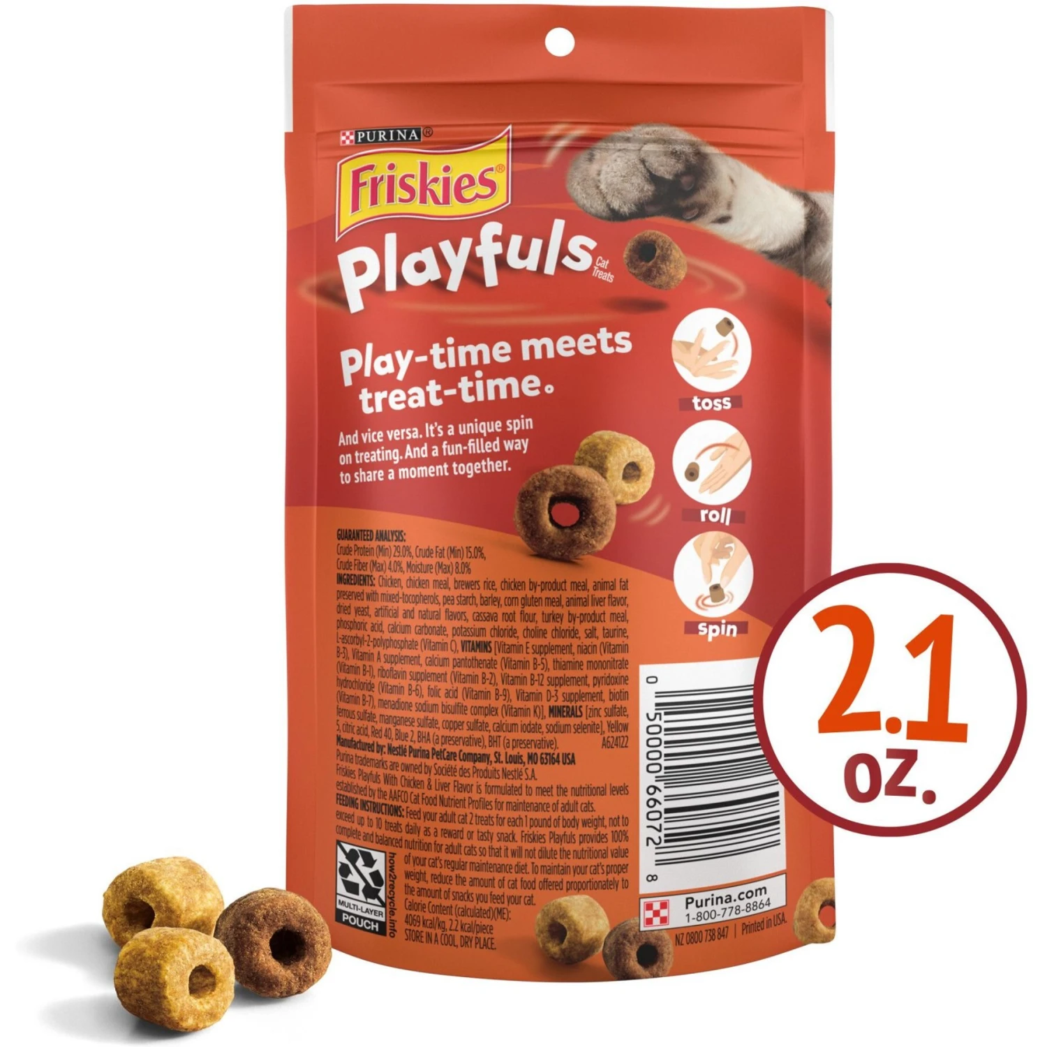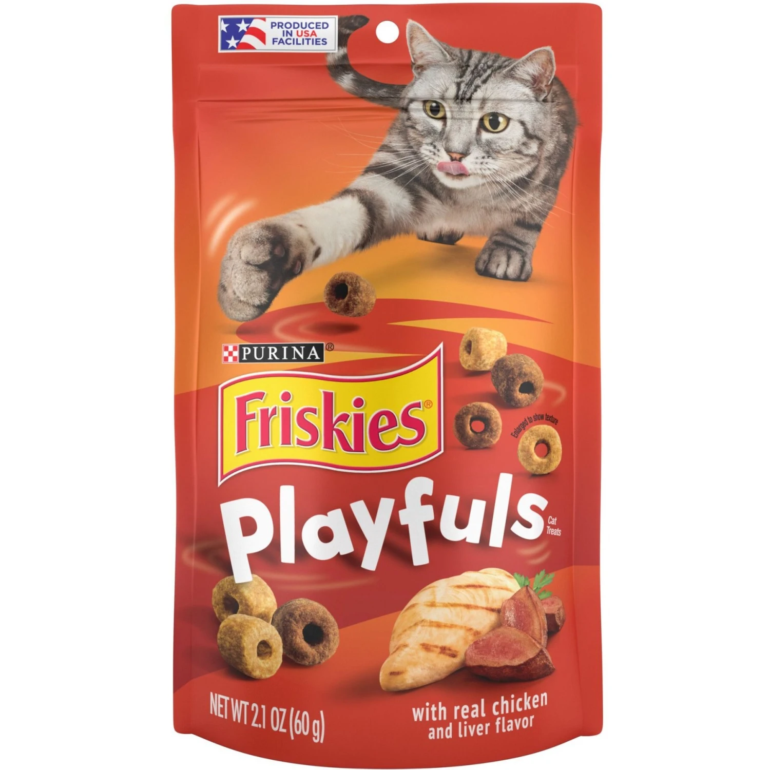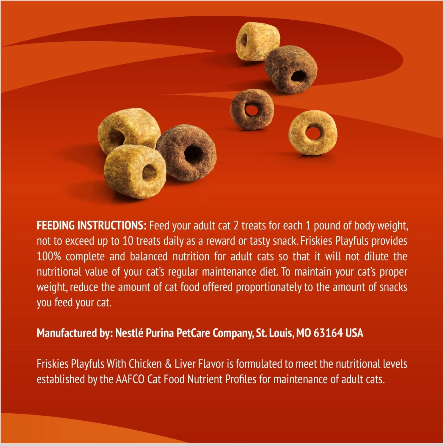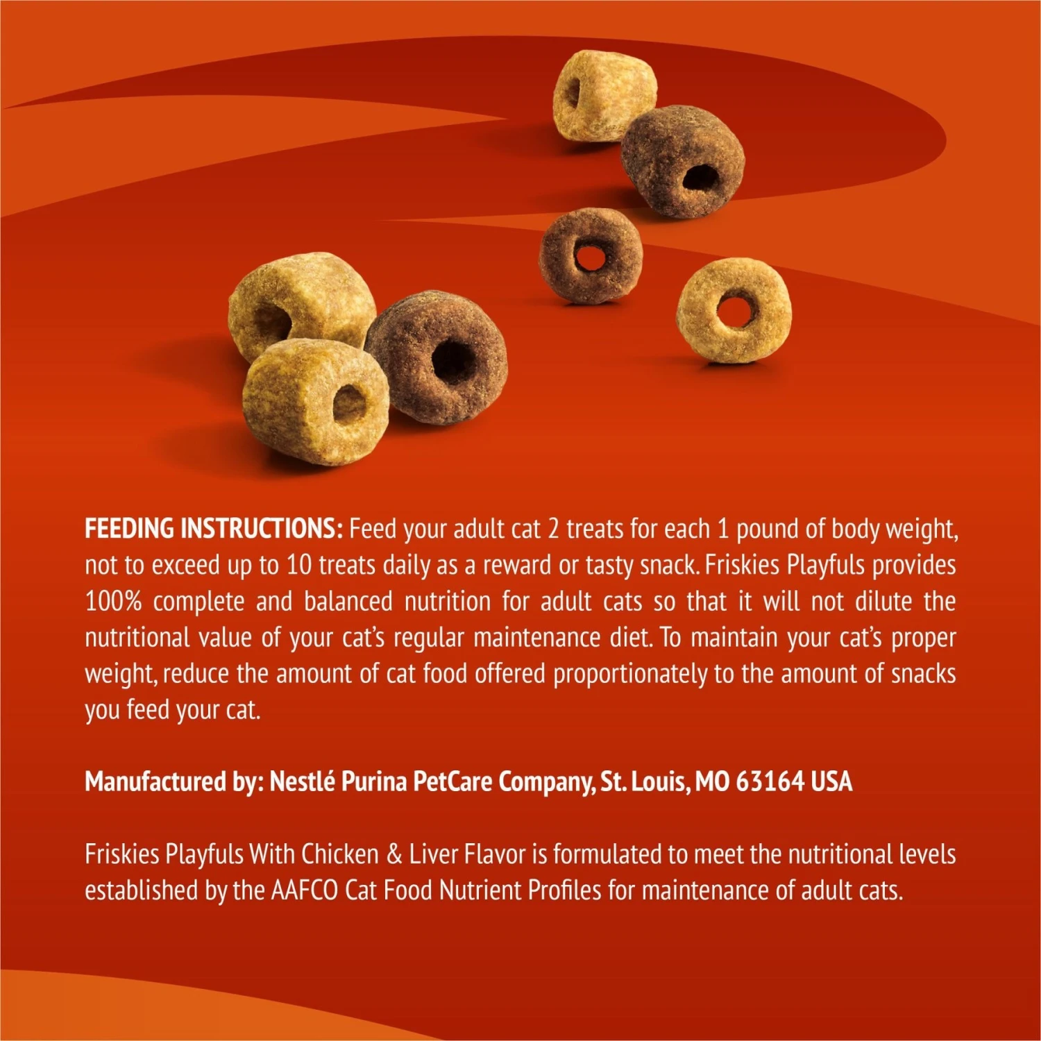 Treat your furry friend to a delicious array of flavors with Friskies Playfuls With Chicken & Liver Flavor Cat Treats! These crunchy treats are made with delicious chicken meat and chicken liver, making each bite packed with protein. Their dry, crunchy texture gives your furry friend essential mental enrichment. Each treat has a fun, unique shape your kitty is bound to enjoy. Whether you’re teaching your pal a new trick, rewarding his good behavior, or just giving him a tasty tidbit after dinner, these delicious treats will put a mouthwatering spin on your feline friend’s daily menu!