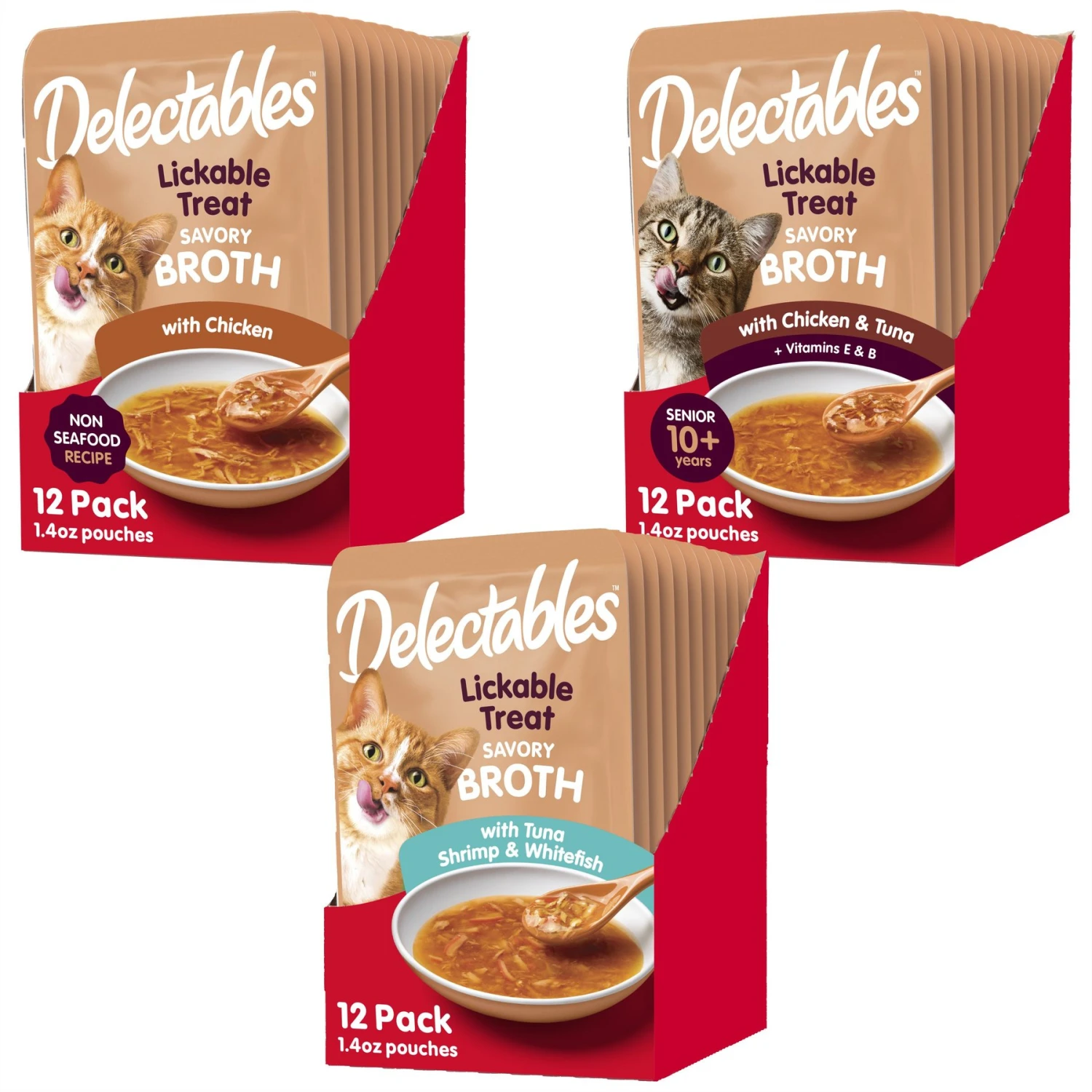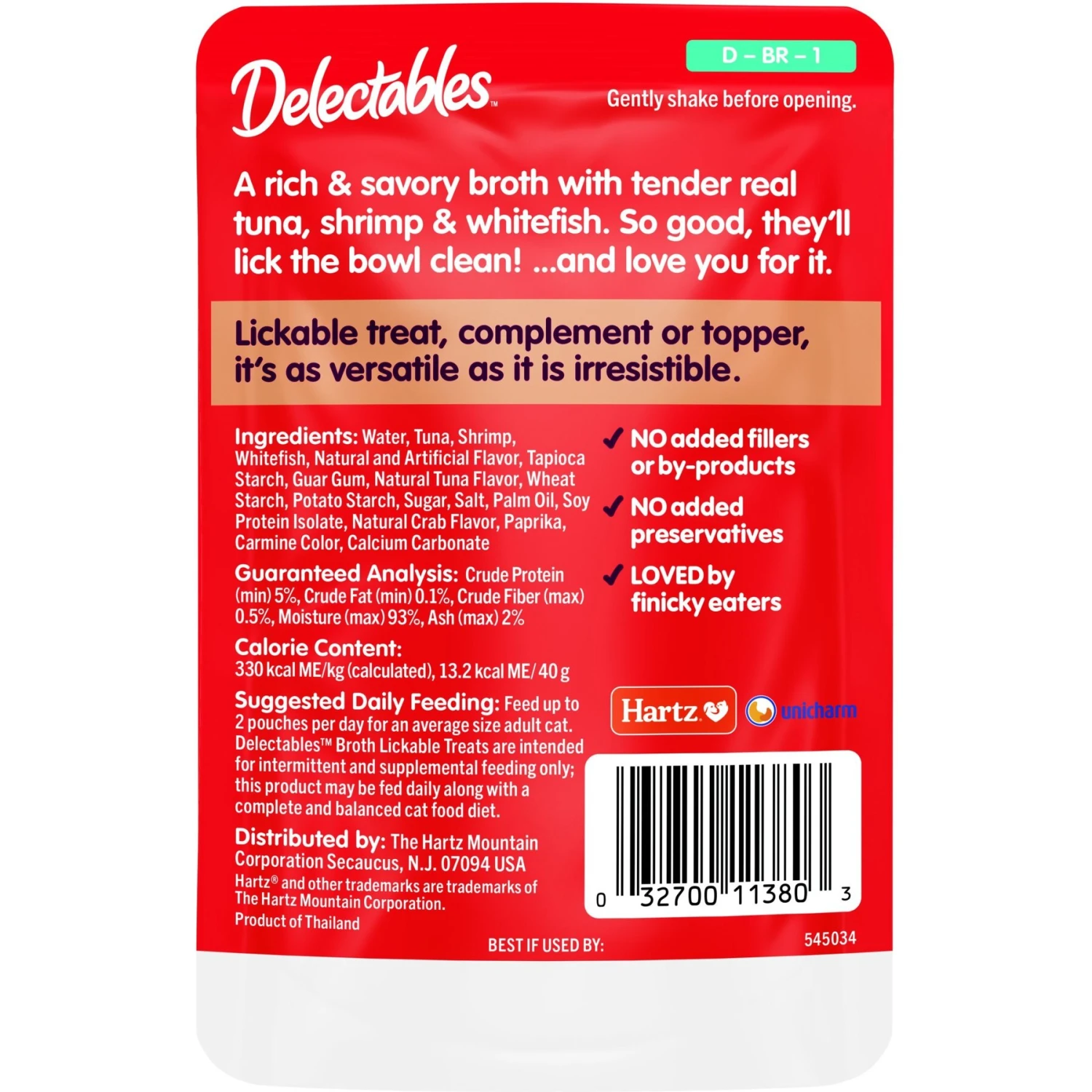 Hartz Delectables Savory Broths Tuna, Shrimp & Whitefish Lickable Cat Treats, 1.4-oz pouch, pack of 12—Your kitty companion is sure to savor every drop of Hartz Delectables Savory Broths Tuna, Shrimp & Whitefish Lickable Treats! This rich broth features a feline-approved combination of real whitefish, shrimp and tuna. The recipe is grain-free and made without fillers, artificial preservatives, colors and by-products. On top of that, the lickable treat also delivers a delicious hydration boost. Whether you serve it as a scrumptious snack or tasty topper, no cat can resist a Delectables Savory Broth!