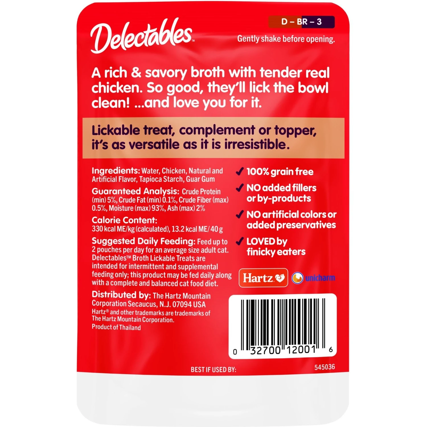 Hartz Delectables Savory Broths Non-Seafood Recipe & Chicken Grain-Free Lickable Cat Treats, 1.4-oz pouch, pack of 12—Hartz Delectables Savory Broths Chicken Lickable Treats are the purr-fect versatile addition to your pet-friendly pantry! This recipe is both seafood- and grain-free. It’s made with scrumptious real chicken and no fillers or artificial preservatives, flavors or by-products. Great as a snack or tantalizing topper, it’ll please even the pickiest playmates. Best of all, the broth is completely lickable and gives cats a super yummy hydration boost. Between meals or mixed in, your furkid will love feasting on Delectables Savory Broths!
