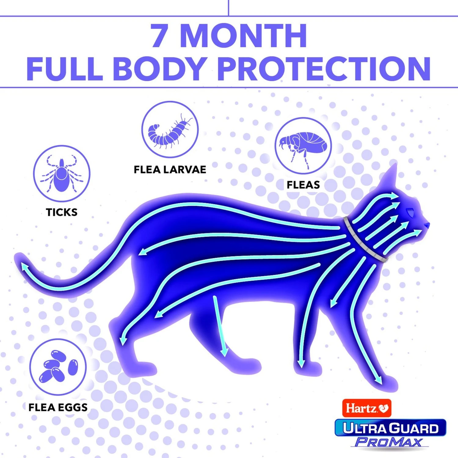 With Hartz UltraGuard ProMax Flea & Tick Collar for Cats and Kittens you can purr-vide your feline friend with the comfort she loves and the protection you trust. This soft collar delivers comfort technology that is backed by a unique patented design. Plus, it kills and repels pesky pests like fleas, ticks, flea eggs and flea larvae, and prevents flea eggs from hatching. The outward facing ridges on the UltraGuard ProMax Cat Collars help prevent skin irritation, while the long-tapered end point allows you to easily put the collar on your cat companion. For additional safety, this collar also has a secure dual buckle system and a pre-determined breakaway point. Paw-fect for multi-cat households, each tin comes with 2, 7-month collars for 14 consecutive months of head to tail protection from fleas and ticks.