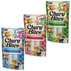 Inaba Churu Bites Chicken Recipe wraps Tuna Recipe Grain-Free Cat Treats, 0.35-oz, pack of 3—Watch your kitty jump with glee for a taste of the sea with Inaba Churu Bites Chicken Recipe wraps Tuna Recipe Grain-Free Cat Treats. These chicken and tuna cat treats are crafted with a soft-baked outside and creamy filling inside for two delicious textures in one bite. They are made using 100% pure chicken and wild tuna that’s seasoned with natural flavors, green tea extract, and vitamin E. These soft treats for cats come in three packs to maintain maximum freshness and are formulated to be free from grains, corn, wheat, soy, preservatives, and artificial colors.