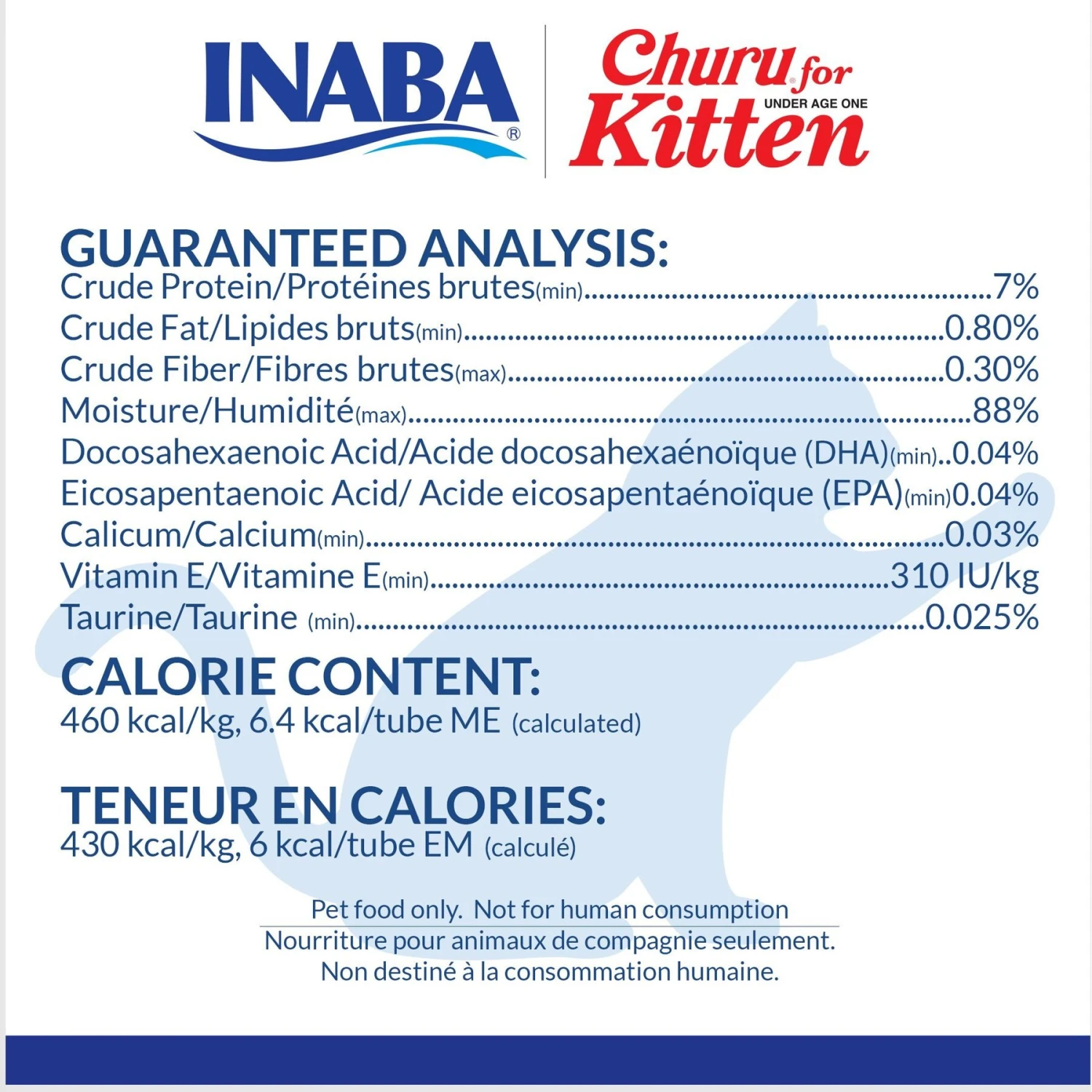 - Inaba keeps grains, preservatives, artificial colors and carrageenan out of Churu for Kittens—a purr-fect choice for kittens under one year old.
