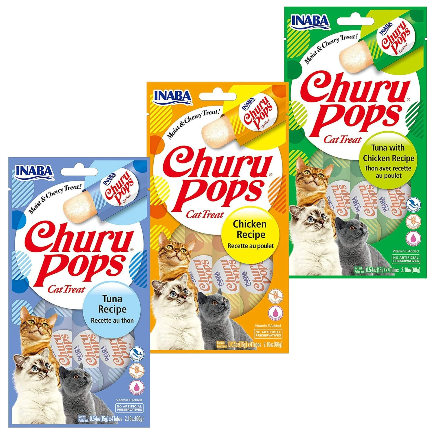 Inaba Churu Pops Moist & Chewy Tuna Recipe Lickable Cat Treats, 0.54-oz tube, pack of 24—Give your furry friend the best of both worlds with Inaba Churu Pops Moist & Chewy Tuna Recipe Lickable Cat Treats. They feature a creamy, lickable center with a chewy outer layer to satisfy your kitty’s senses. These treats are made with real, deep sea tuna and have plenty of moisture for your paw-tner’s health. They also contain no grains, preservatives, or artificial colors with low calories for a treat you can trust. Ideal as a reward or tasty topper, Churu Pops Moist & Chewy Tuna Recipe Lickable Cat Treats are a great way to bond with your companion.