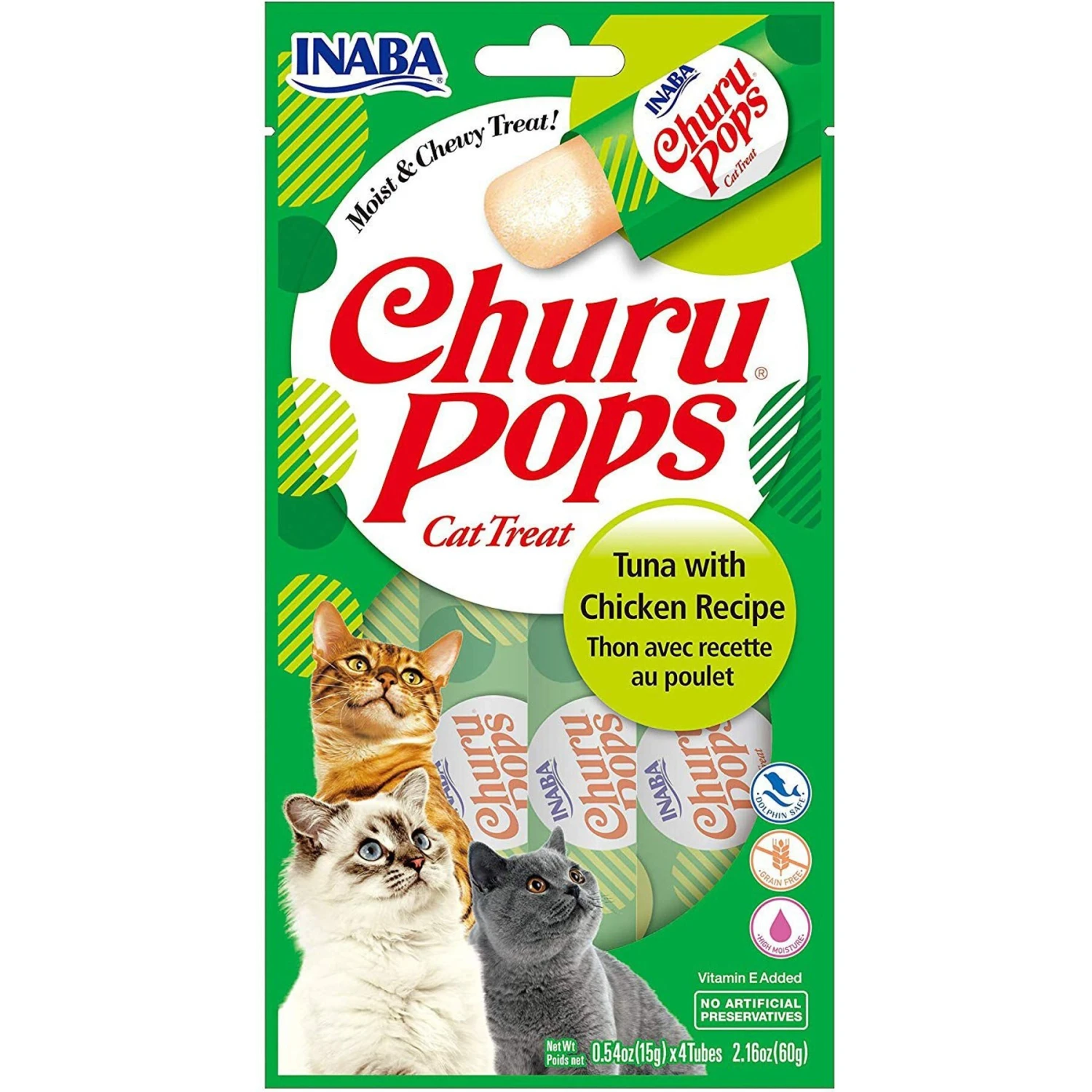 Inaba Churu Pops Moist & Chewy Tuna with Chicken Recipe Lickable Cat Treats, 0.54-oz tube, pack of 24—Give your furry friend the best of both worlds with Inaba Churu Pops Moist & Chewy Tuna with Chicken Recipe Lickable Cat Treats. They feature a creamy, lickable center with a chewy outer layer to satisfy your kitty’s senses. Made with real, deep sea tuna and farm-raised chicken, these treats have plenty of moisture for your paw-tner’s health. They also contain no grains, preservatives, or artificial colors with low calories for a treat you can trust. Ideal as a reward or tasty topper, Inaba Churu Pops Moist & Chewy Tuna with Chicken Recipe Lickable Cat Treats are a great way to bond with your companion.