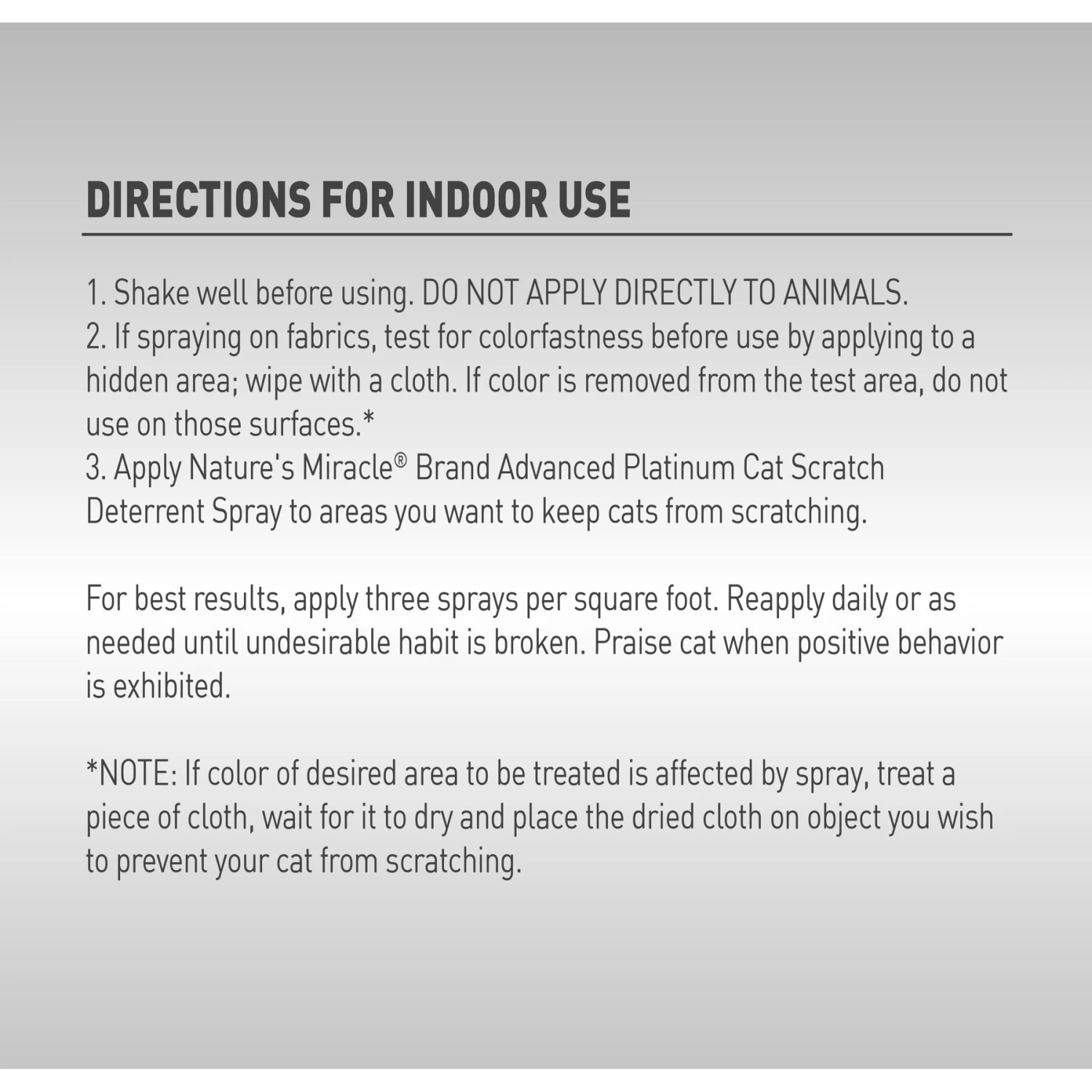 *NOTE: If desired area to be treated is affected by spray, treat a piece of cloth, wait for it to dry and place the dried cloth on object you wish to keep cat away from.