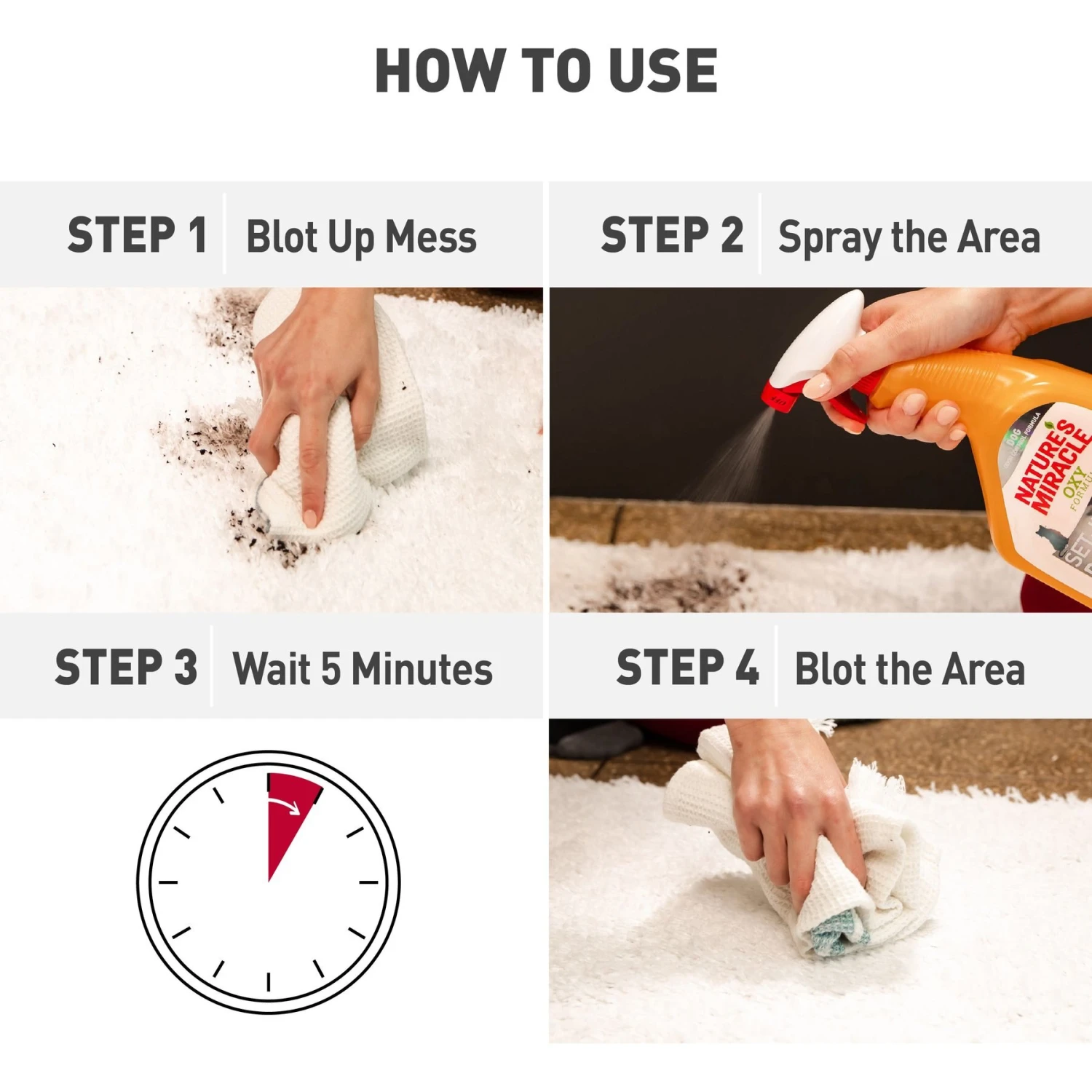 Stain Removal: Wipe away any excess stain-causing material, then soak the surface thoroughly with Nature’s Miracle® Just for Cats™ Orange-Oxy Stain and Odor Remover. Wait 5 minutes, then wipe away stain with a cloth. For tough stains, use a stiff, bristle brush. If the stain is not completely removed, re-soak area and allow to work for 1 hour before wiping with a cloth.