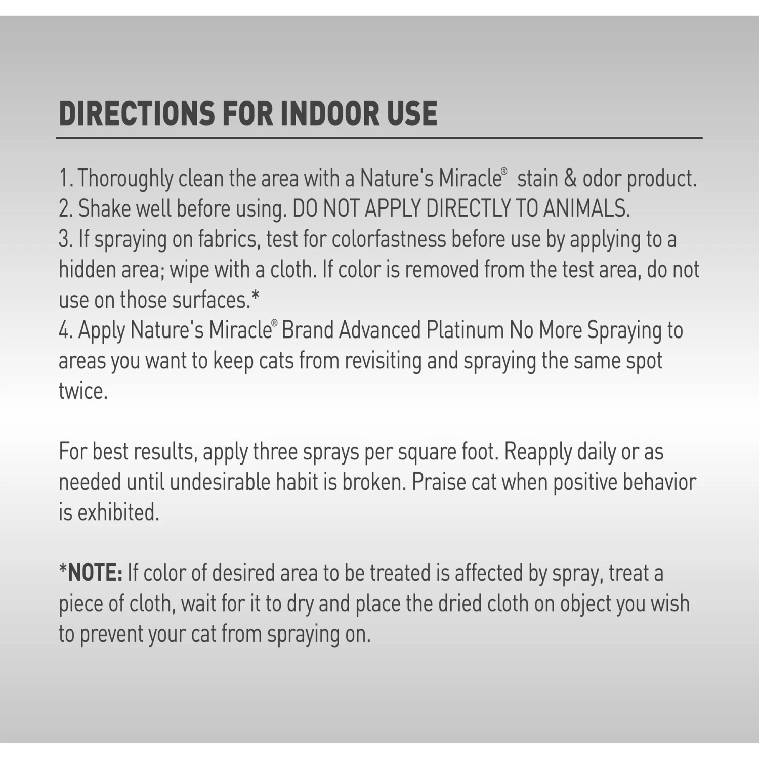To Prevent Repetitive Spraying: Thoroughly soak previously stained area with Nature’s Miracle Just for Cats No More Spraying Stain and Odor Remover. Wait five minutes, then pat area with a cloth. For areas that have been repeatedly marked, a second application may be needed.