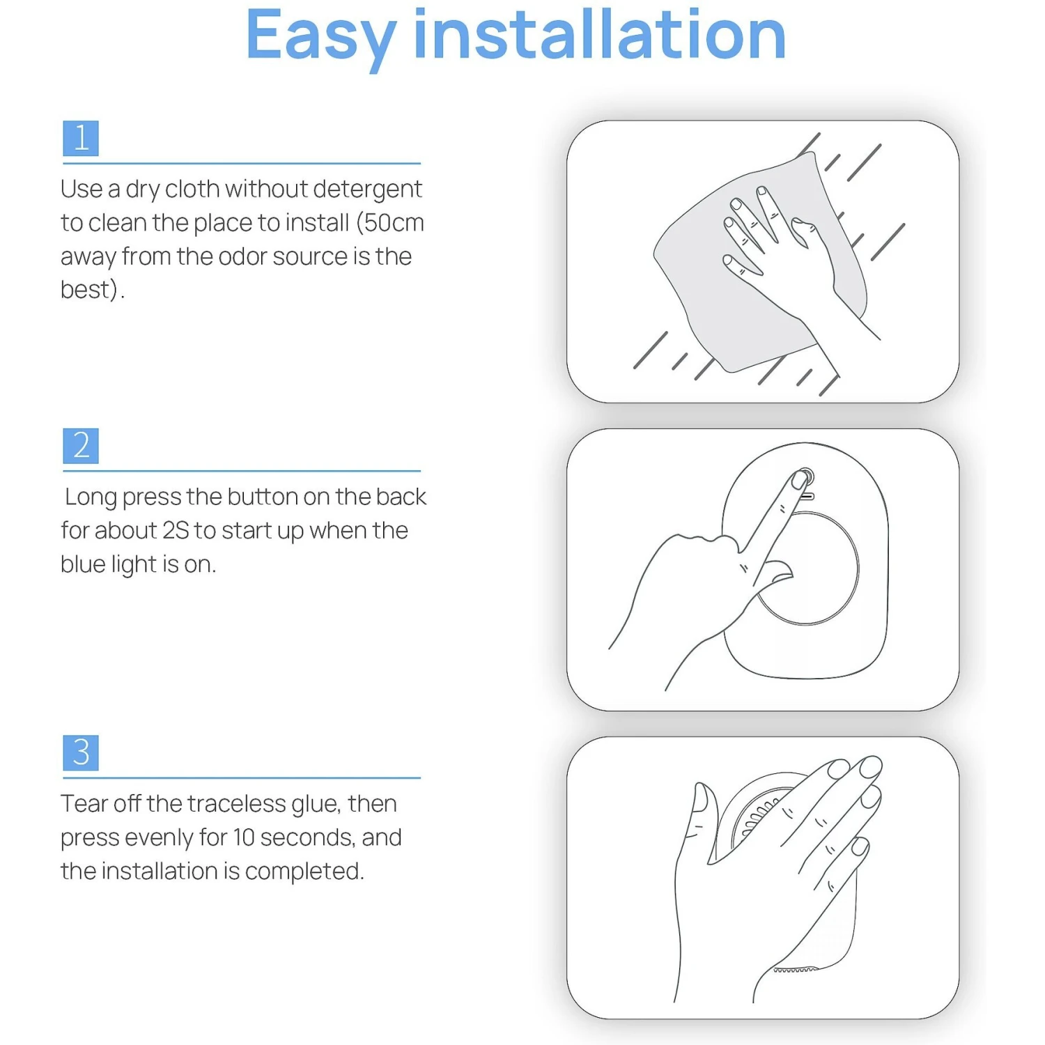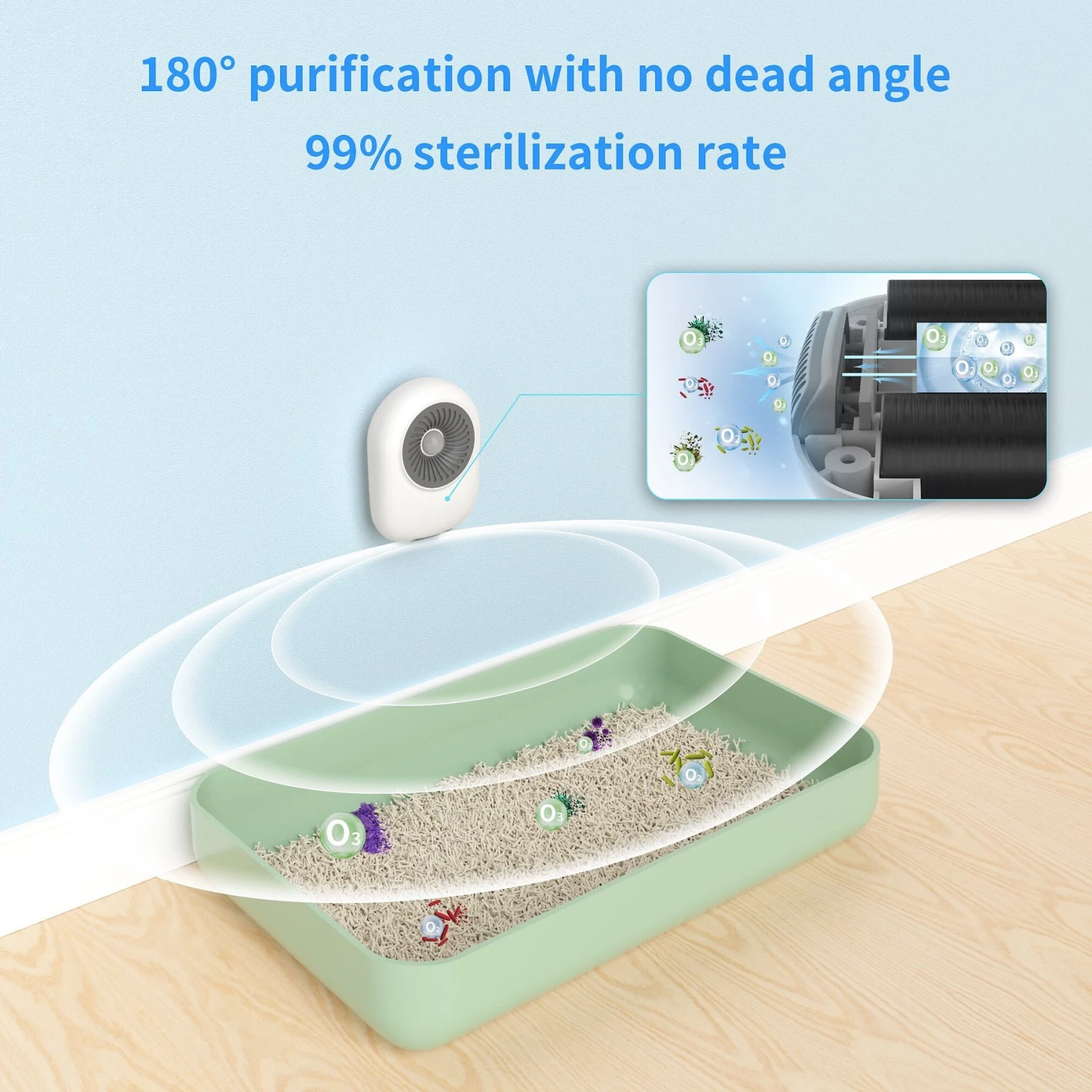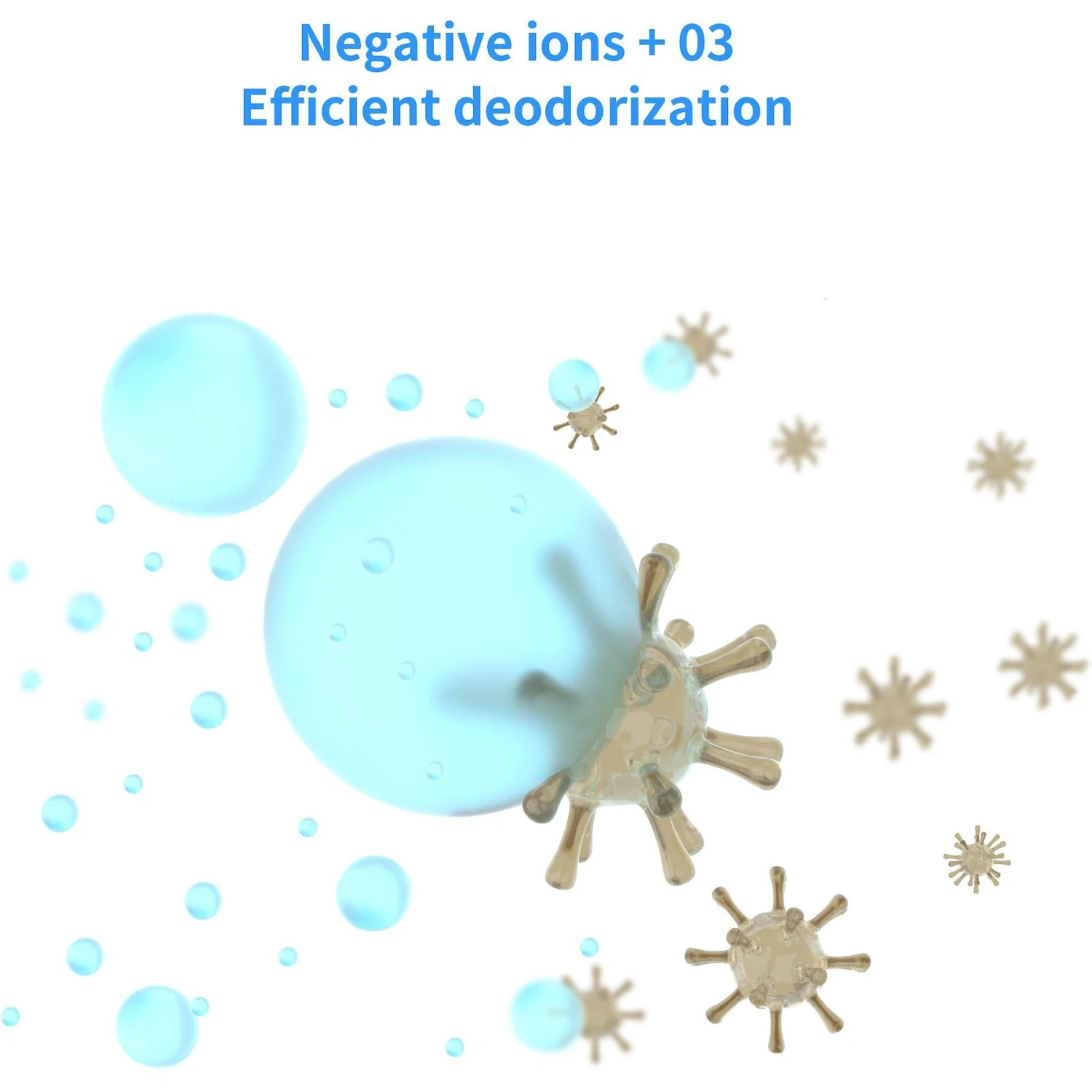 - Produces negative ions to oxidize and decompose ammonia, hydrogen sulfide and other odor components, stopping bad smells at the source.
