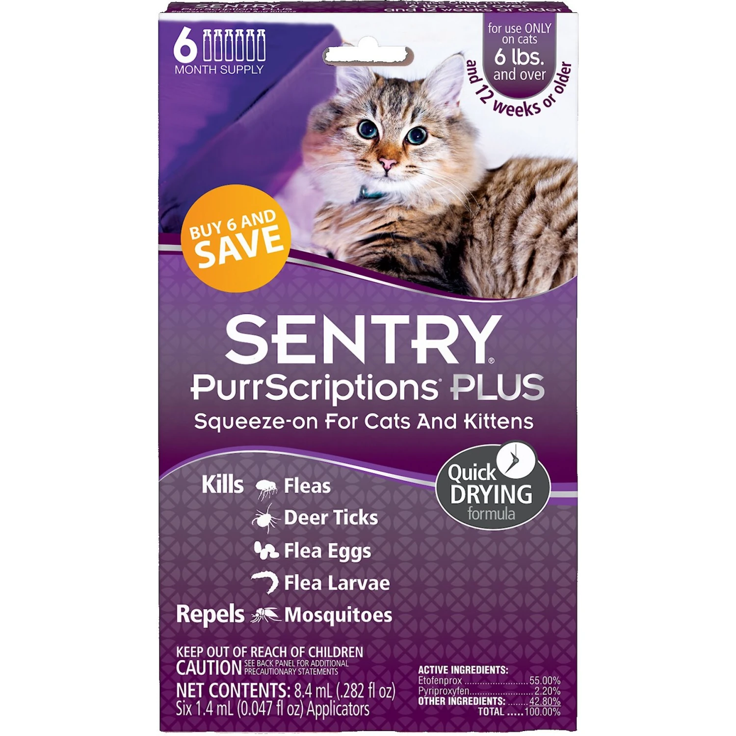 PurrScriptions Plus Flea & Tick Squeeze-On for Cats and Kittens is formulated with an adulticide called Etofenprox. Etofenprox has a very low toxicity profile. When applied monthly, PurrScriptions Plus kills adult fleas, ticks & repels mosquitoes, including the mosquito that carries West Nile virus, for up to one month. Also includes pyriproxyfen, an insect growth regulator that kills flea egg and larvae for up to three months per application. Five Way Protection!