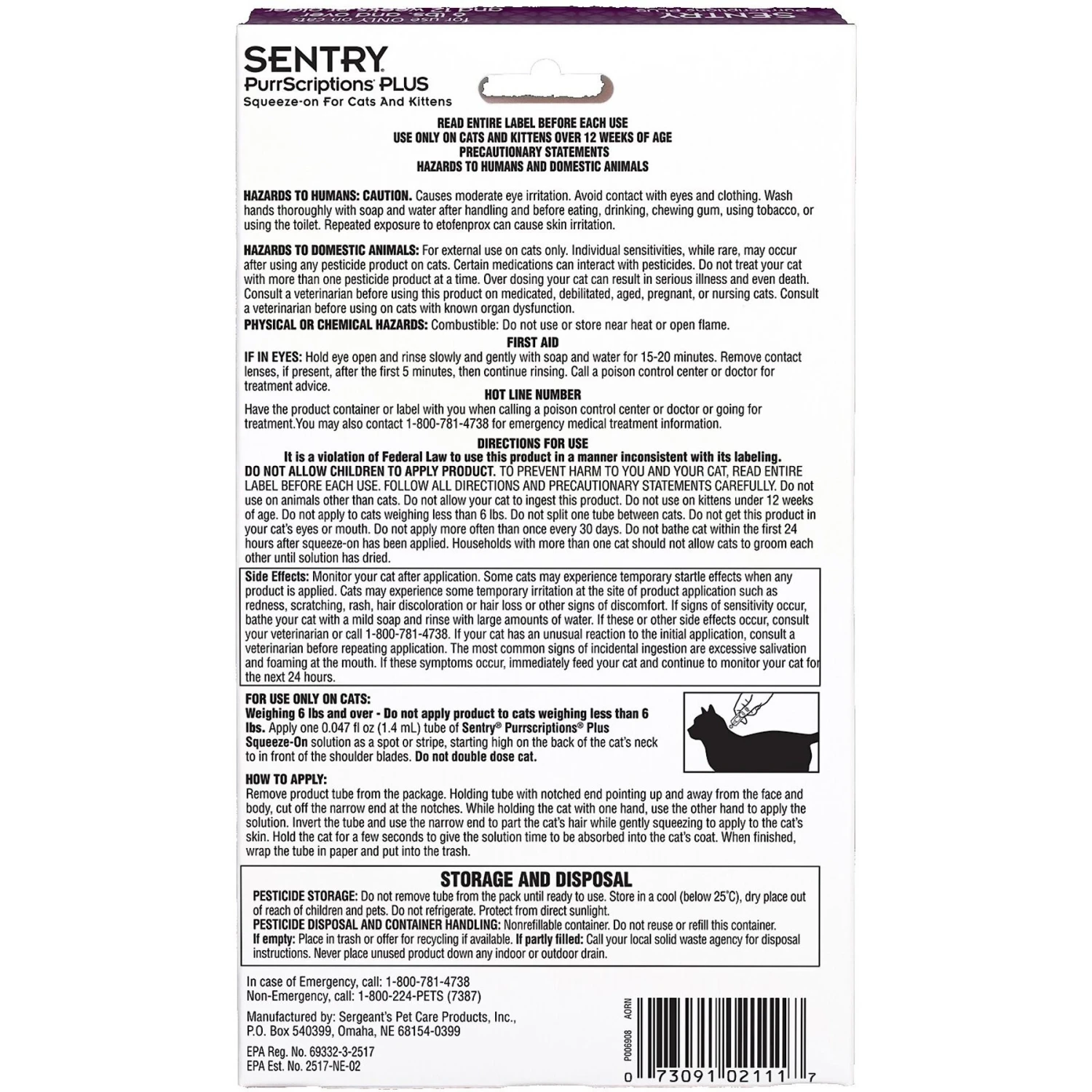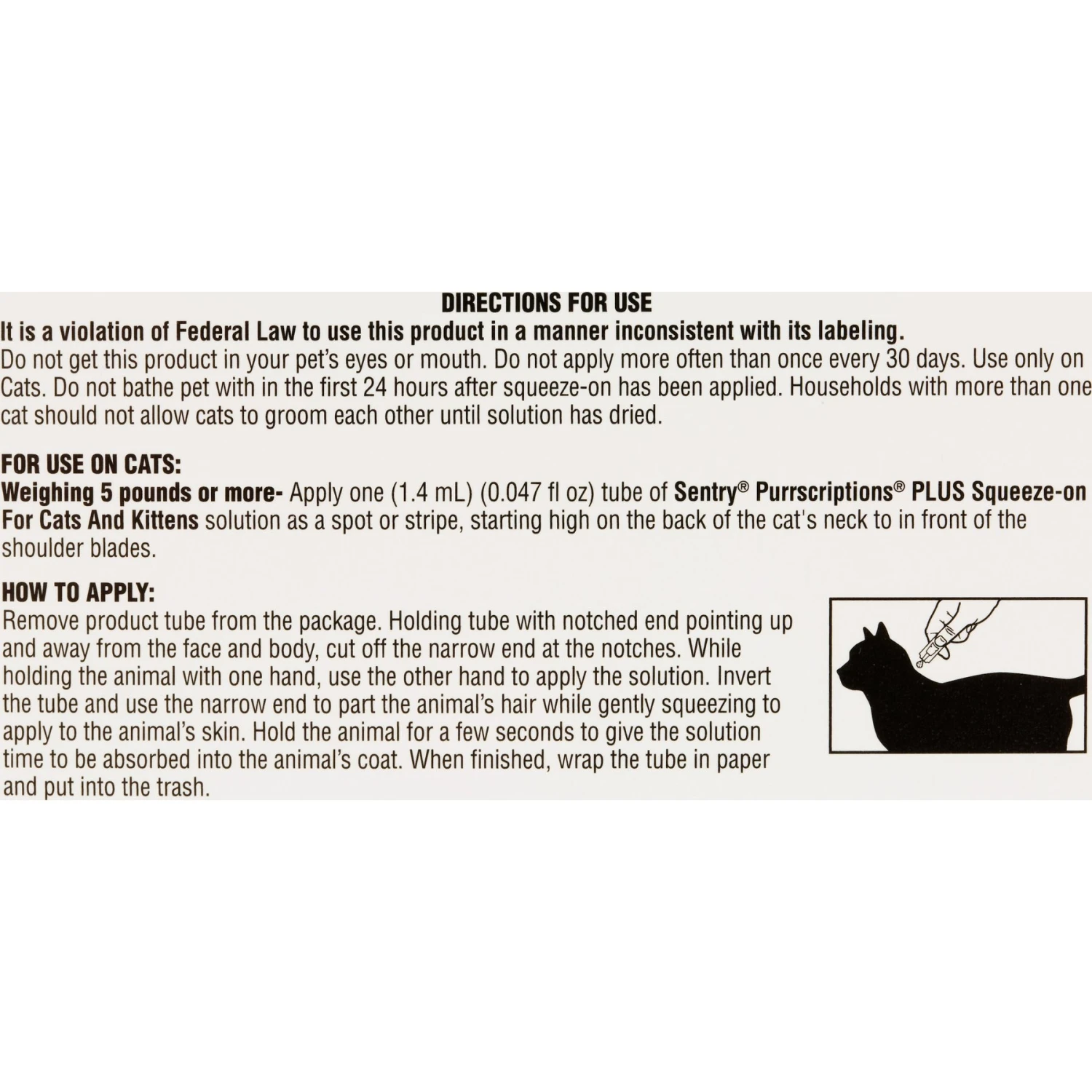 Remove product tube from the package. Holding tube with notched end pointing up and away from the face and body, cut off the narrow end at the notches. While holding the animal with one hand, use the other hand to apply the solution. Invert the tube and use the narrow end to part the animal’s hair while gently squeezing to apply to the animal’s skin starting high on the back of the cat’s neck to in front of the shoulder blades. Hold the animal for a few seconds to give the solution time to be absorbed into the animal’s coat. When finished, wrap the tube in paper and put into the trash.