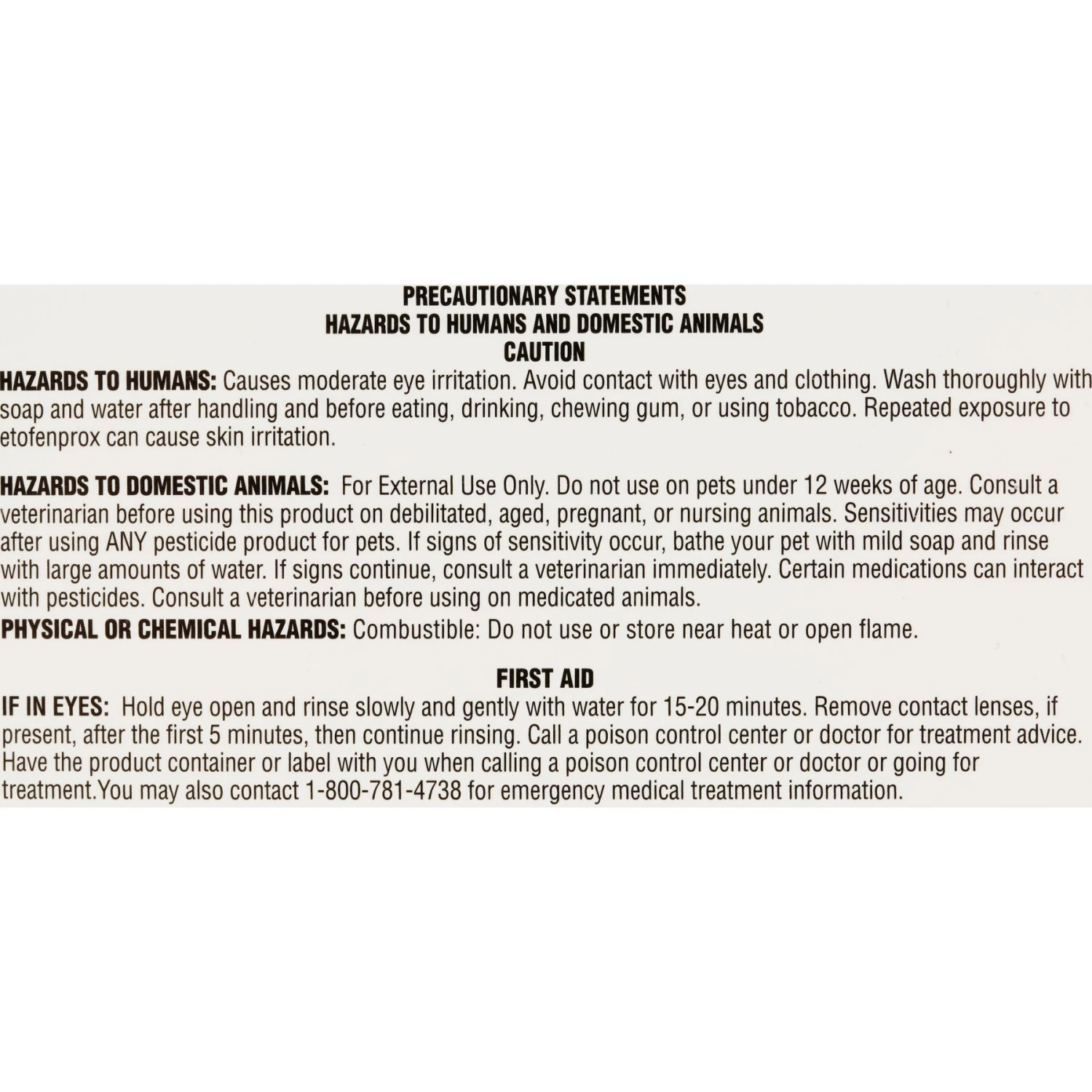 Causes moderate eye irritation. Avoid contact with eyes and clothing. Wash thoroughly with soap and water after handling and before eating, drinking, chewing gum, or using tobacco. Repeated exposure to etofenprox can cause skin irritation. For External Use Only. Do not use on pets under 12 weeks of age.