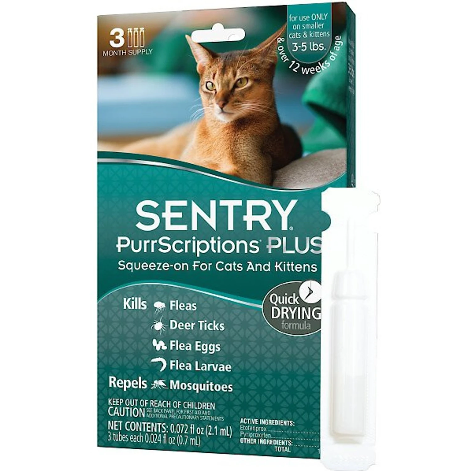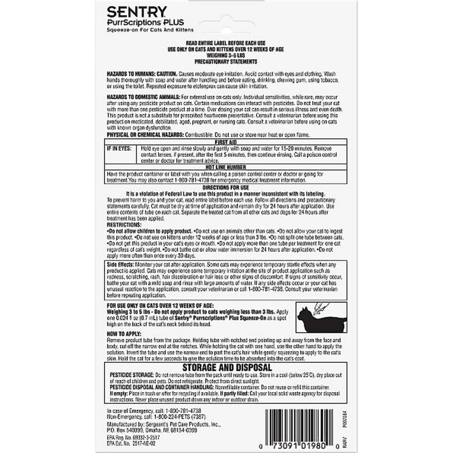 PurrScriptions Plus Flea & Tick Squeeze-On for Cats and Kittens is formulated with an adulticide called Etofenprox. Etofenprox has a very low toxicity profile. When applied monthly, PurrScriptions Plus kills adult fleas, ticks & repels mosquitoes, including the mosquito that carries West Nile virus, for up to one month. Also includes pyriproxyfen, an insect growth regulator that kills flea egg and larvae for up to three months per application. Five Way Protection!