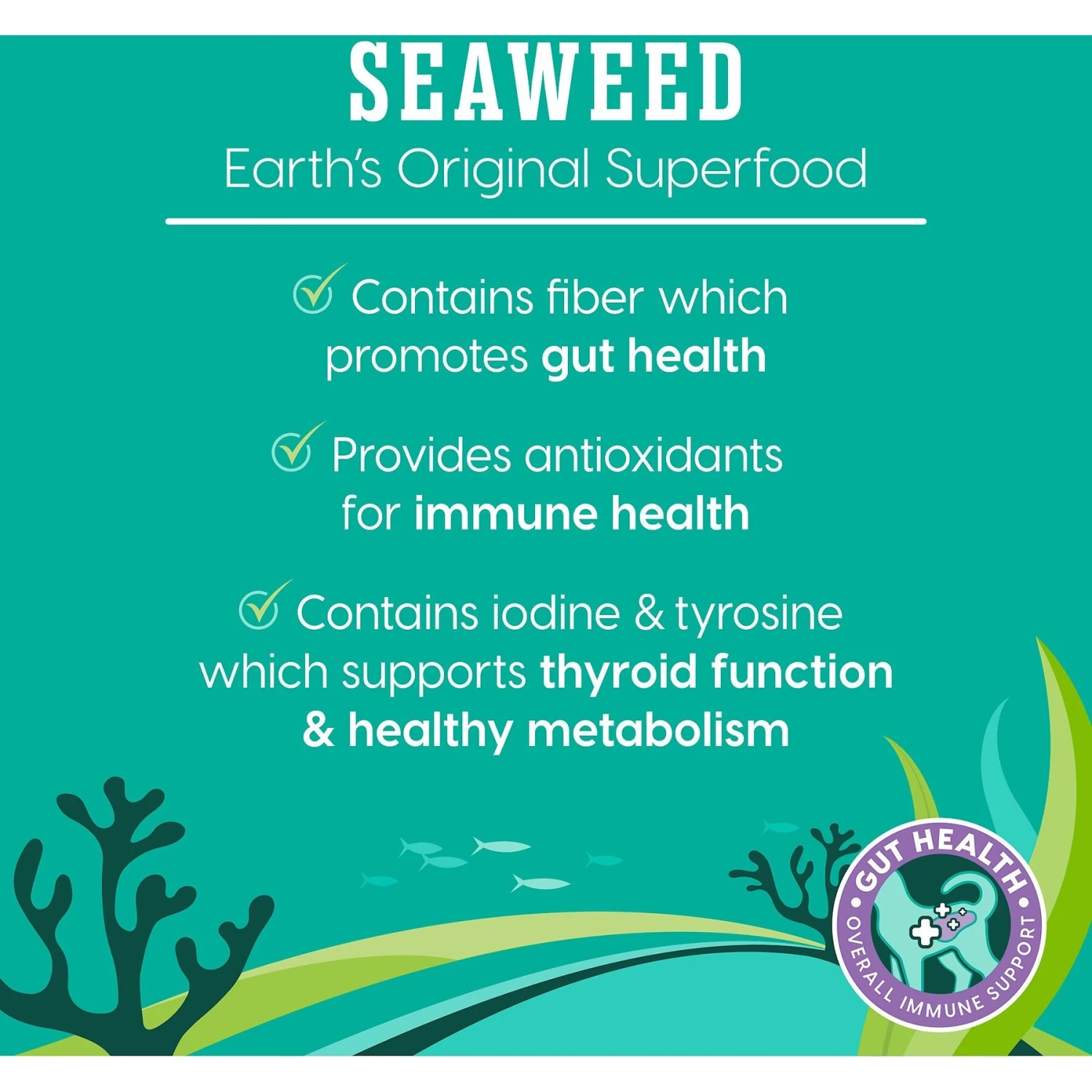 - Iodine and tyrosine naturally occur in seaweed to support thyroid function and your kitty’s metabolism while amino acids support her bread health.