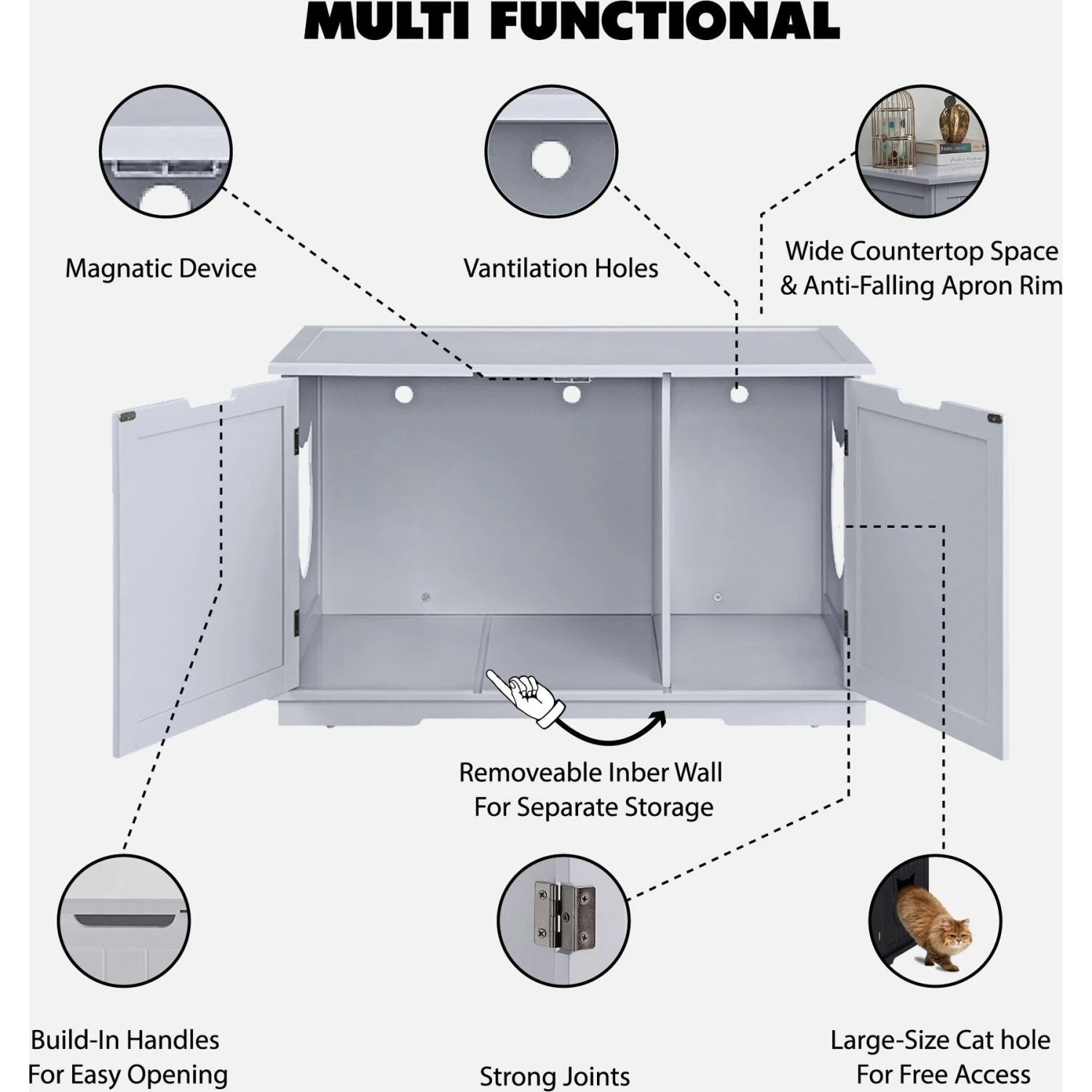 - Multifunctional cat litter box enclosure doubles as a stylish furniture piece in your home.