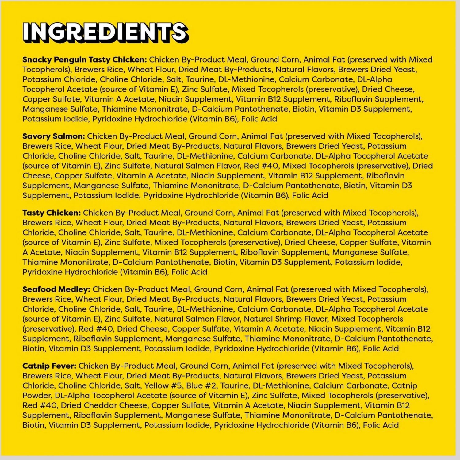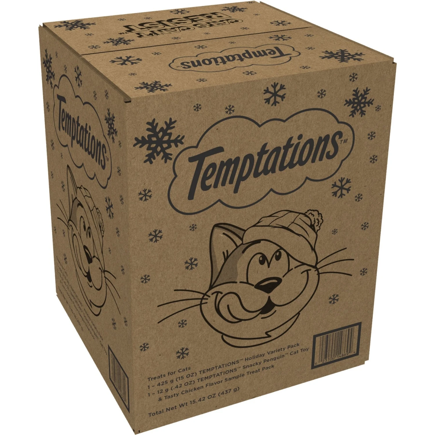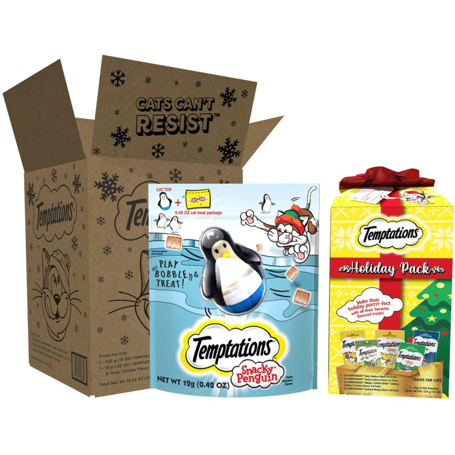 - Holiday gift pack features 4 cat treat pouches in whisker-licking flavors, a penguin cat toy, and a sample treat pack.