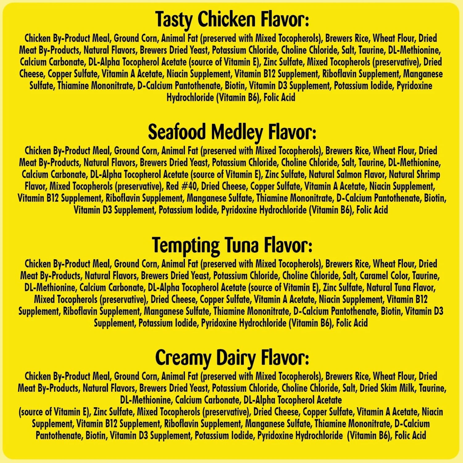 | Flavor | Hearty Beef, Feline Favorites Pack, Rockin' Lobster, Blissful Catnip, Crabby Crab, Seafood Medley, Tantalizing Turkey, Dairy, Tuna, Shrimp, & Turkey Pack, Shrimpy Shrimp, Creamy Dairy, Tasty Chicken, Feline Favorites Classic Pack, Seafood Lovers Pack, Tempting Tuna, Savory Salmon |