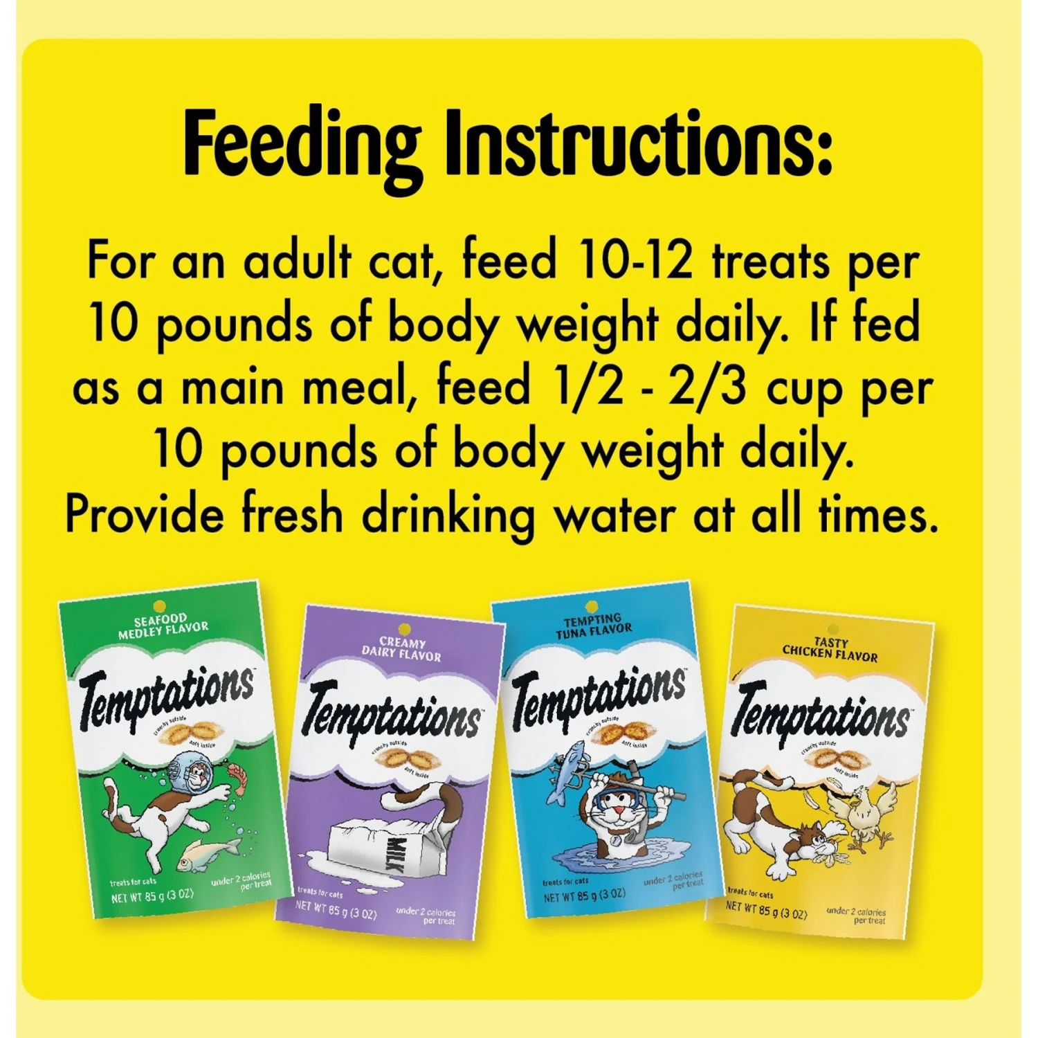- Treats come in convenient lock and seal pouches for optimal freshness. Your kitty will love the variety of Temptations four classic and irresistible flavors.