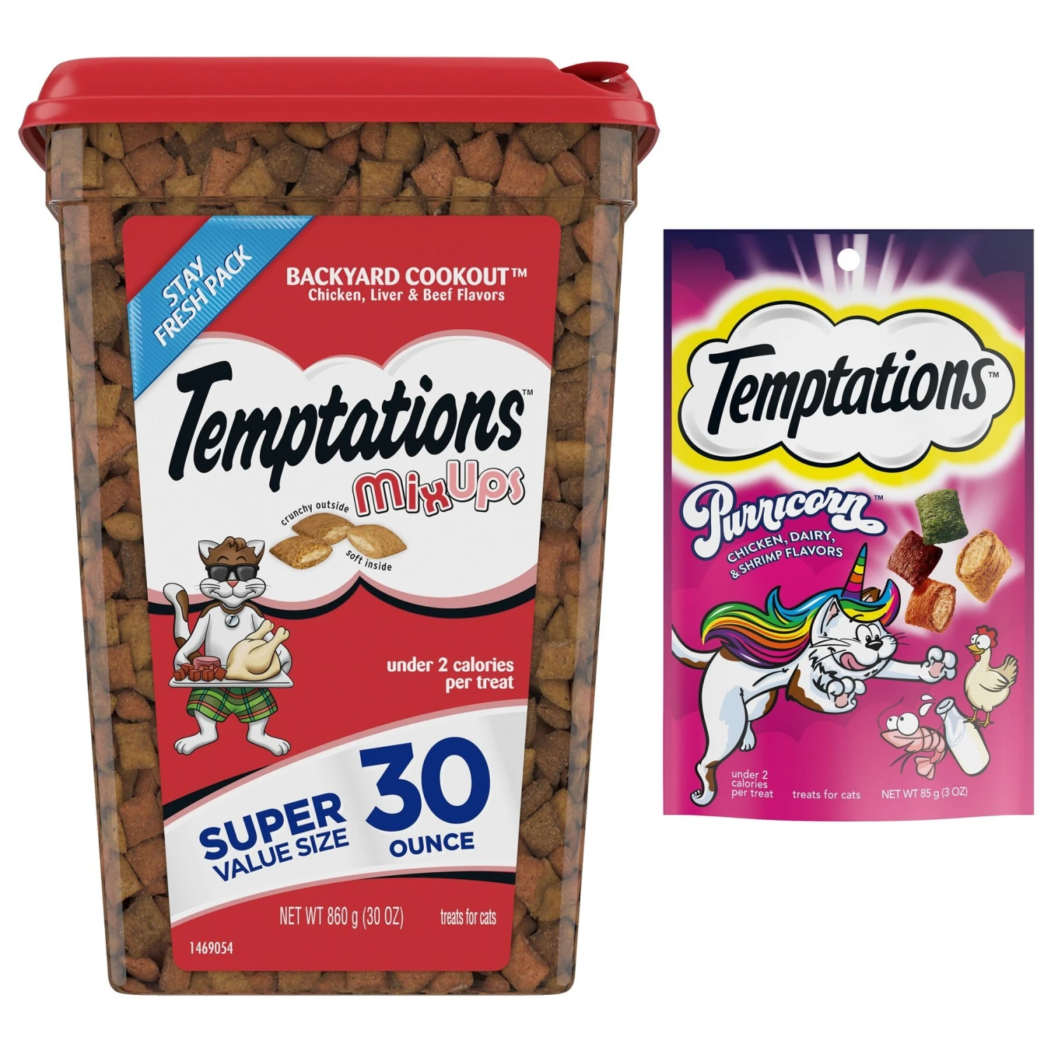 Temptations MixUps Backyard Cookout Flavor Soft & Crunchy Cat Treats & Temptations MixUps Purricorn Chicken Dairy & Shrimp Flavors Crunchy & Soft Cat Treats, 3-oz Bag