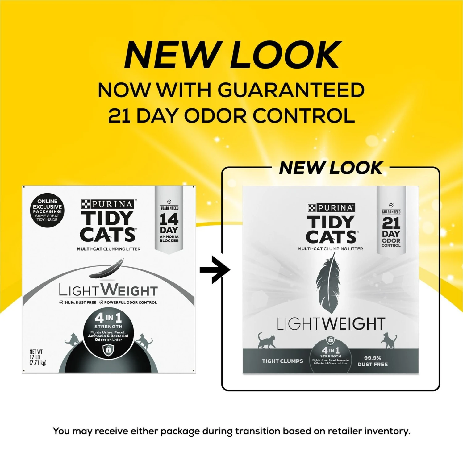 Lock away cat litter box odors with Purina Tidy Cats LightWeight 4-in-1 Strength Clumping Litter. This 4-in-1 kitty litter formula wows with an advanced deodorizing system that neutralizes the four foes of freshness—urine, fecal, ammonia and bacterial odors. With all that power, the odor control cat litter helps keep your home smelling like home. The scented cat litter leaves behind a complex floral scent in the cat litter box. Even better, this lightweight litter is half the weight of the leading clumping cat litter formulas. You get less weight, not less kitty litter, which makes it easy to carry and pour for your kitties. The moisture-absorbent kitty litter also forms tight, light clumps that are easy to scoop. And, the lightweight cat litter is low-dust, meaning it pours cleanly into the cat litter box. Help make the cat litter box area feel a little more like home for your feline family with this advanced lightweight litter.
