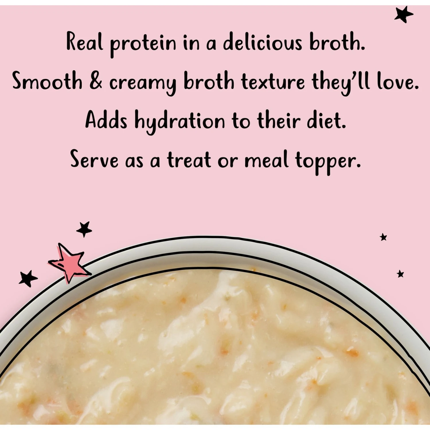 - A smooth and creamy broth made with wholesome ingredients that’ll have your feline friend licking their bowl clean.