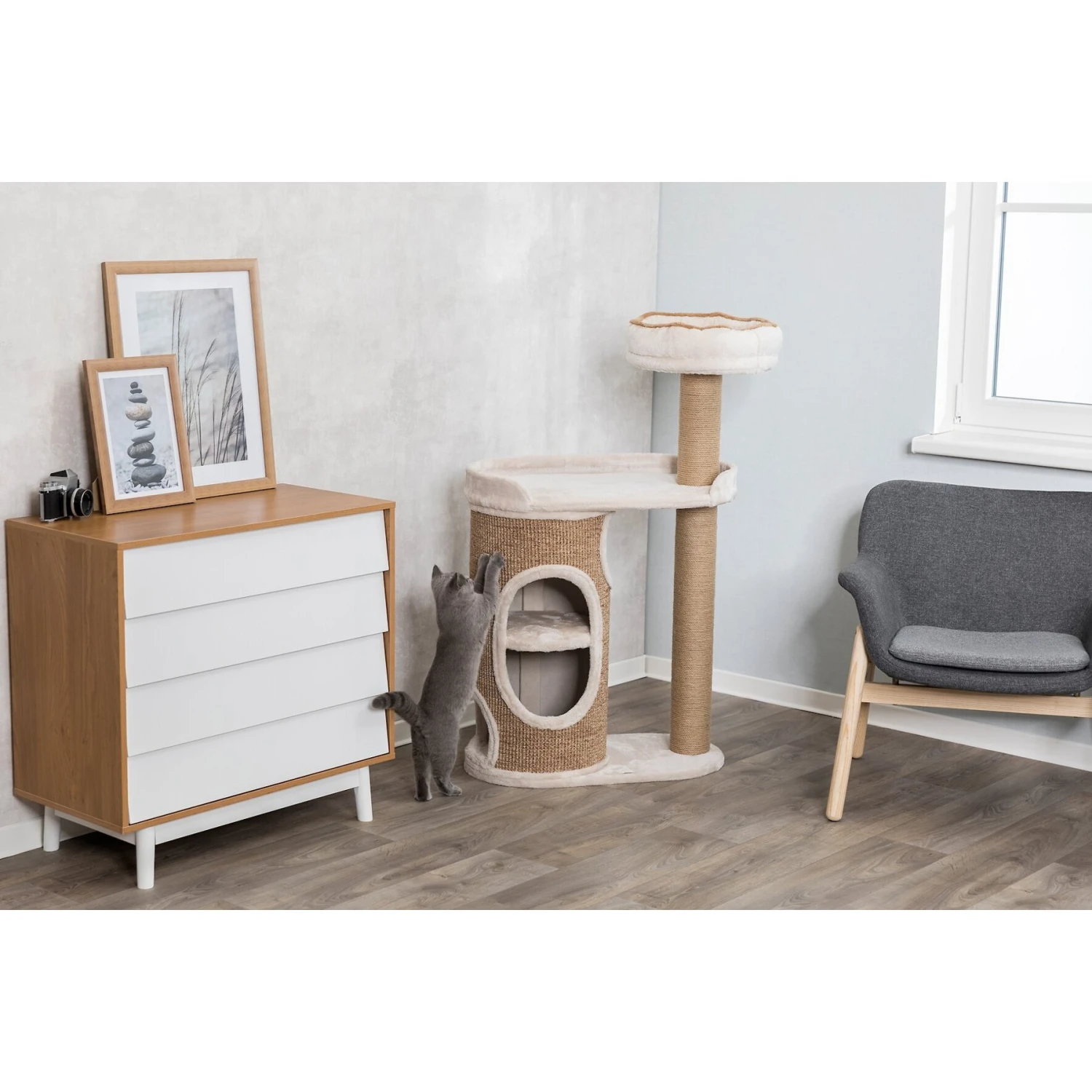 - Speaks to your cat’s love for scratching with a jute-wrapped barrel and jute-made posts.