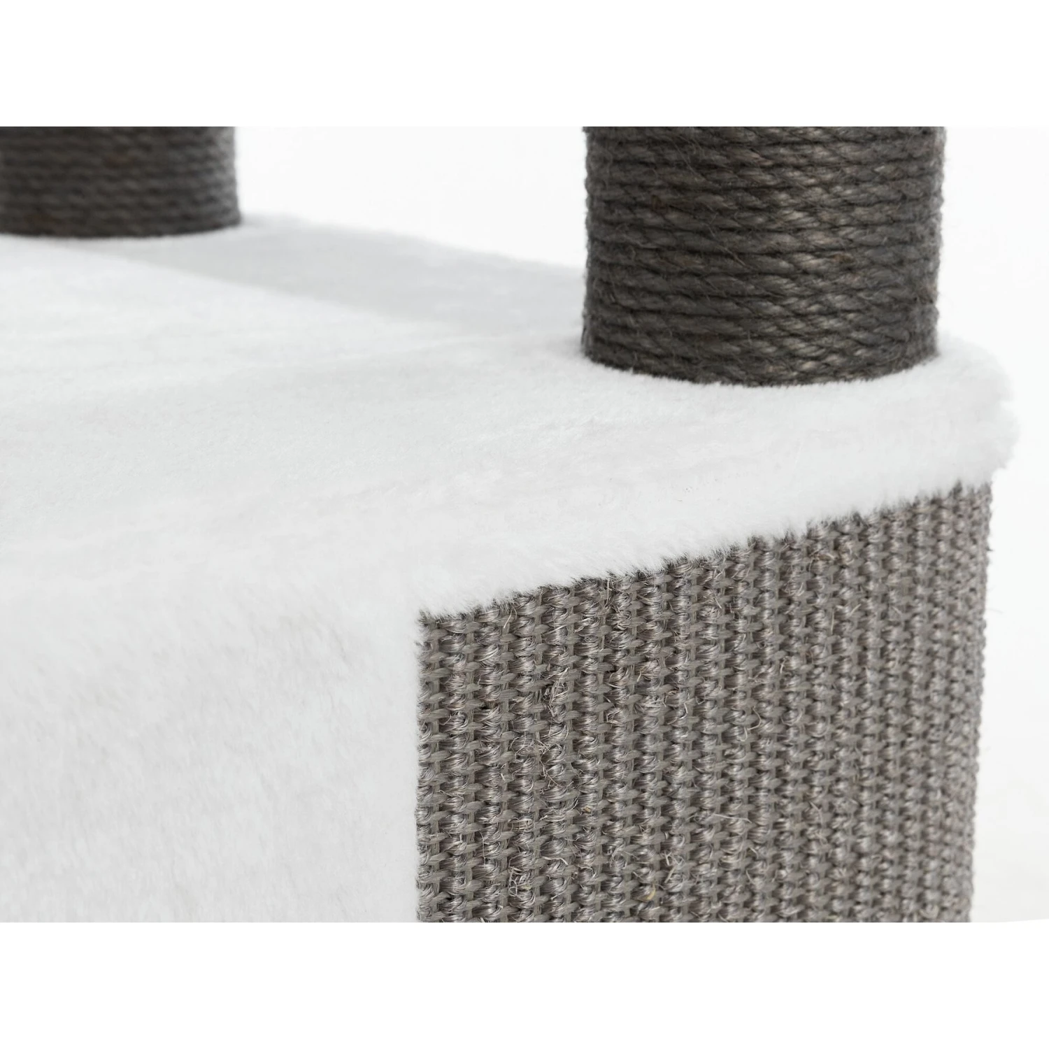 - 43-inch, multi-level cat tree is covered in a combination of plush fabric and scratching surfaces.