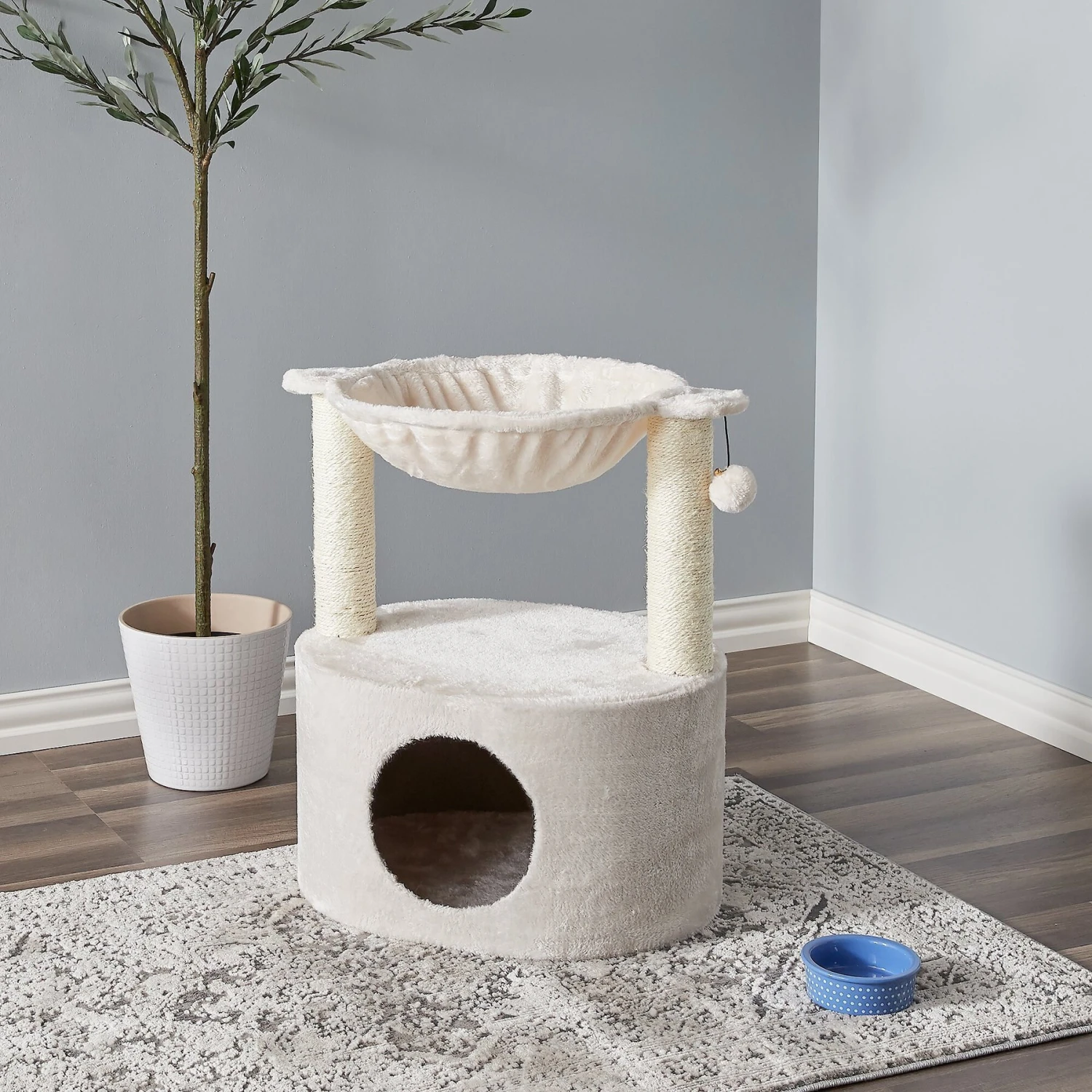 - Condo, scratching post and hammock bed create the ultimate space for both naptime and playtime.