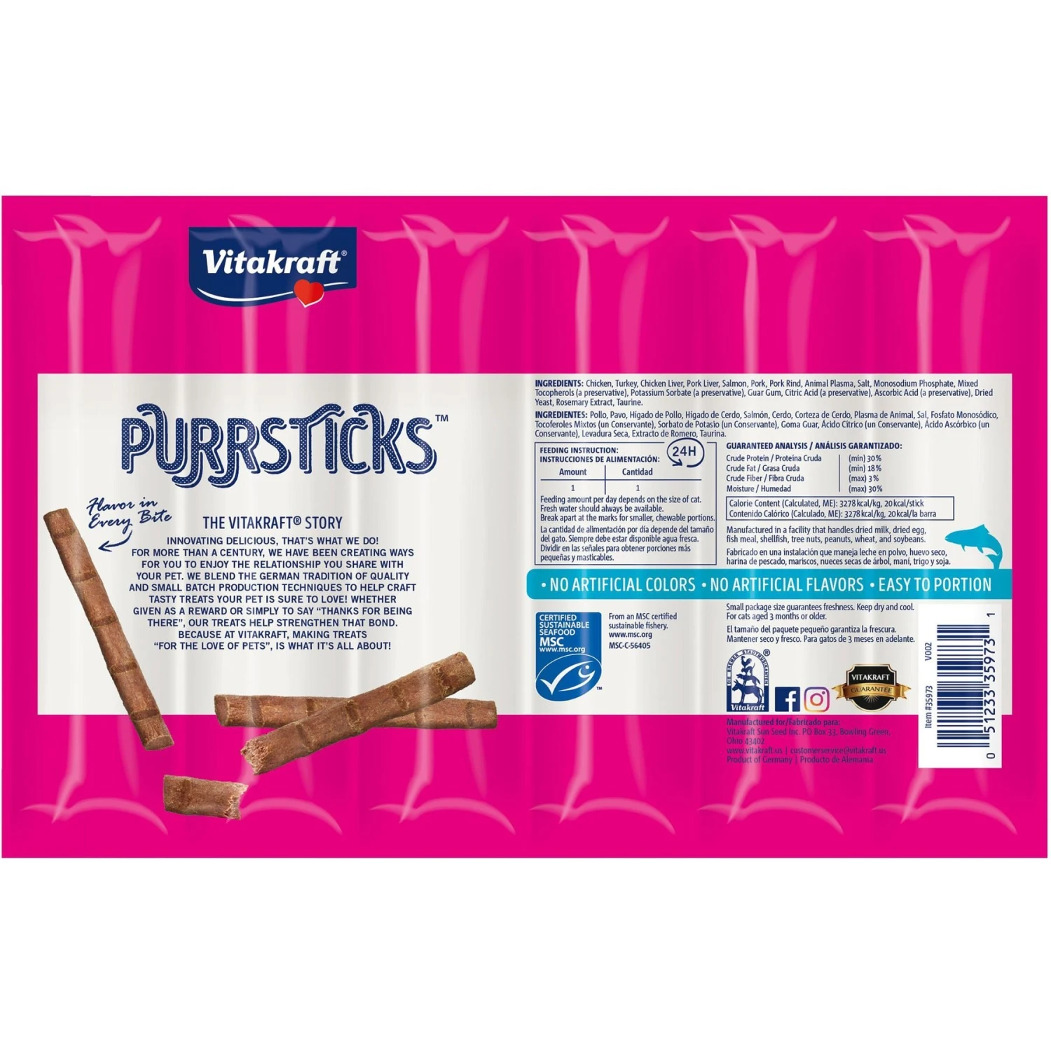 - Contains multiple packs of PurrSticks Chicken Recipe with Salmon.