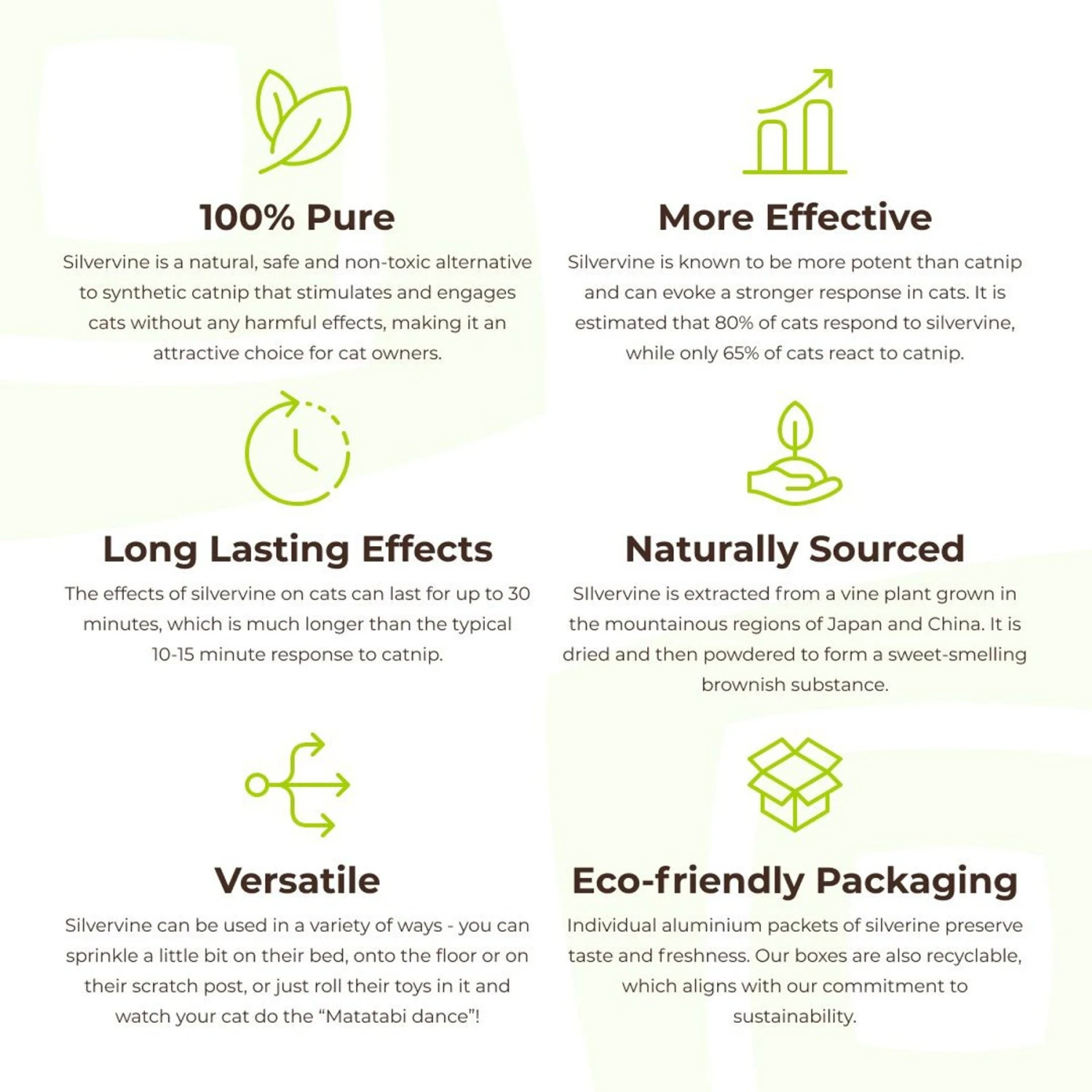 - Natural, safe and non-toxic alternative to synthetic catnip.
